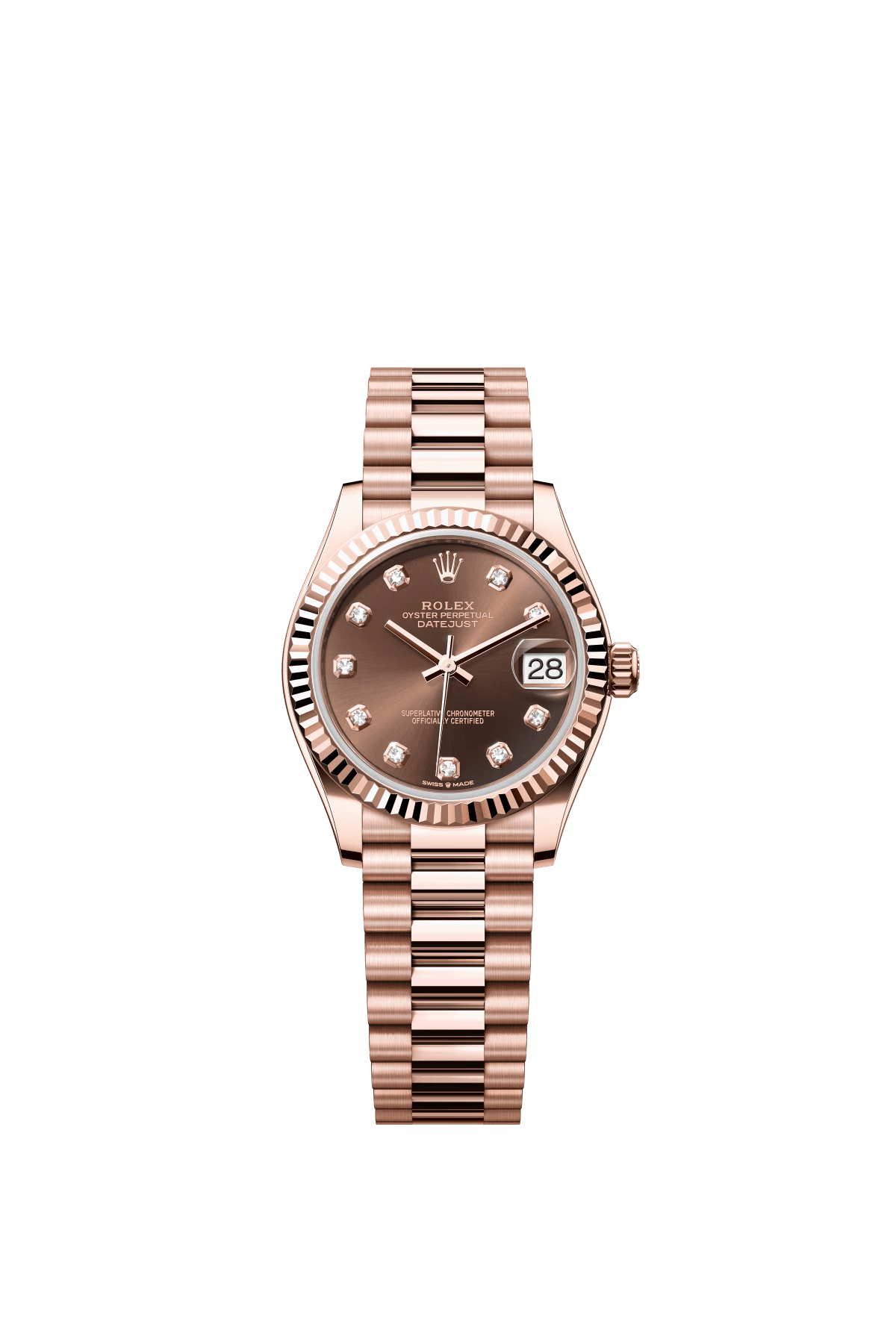 The Oyster Perpetual Datejust 31 in 18 ct Everose gold with a chocolate-coloured diamond-set dial and a President bracelet. -m278275-0010
