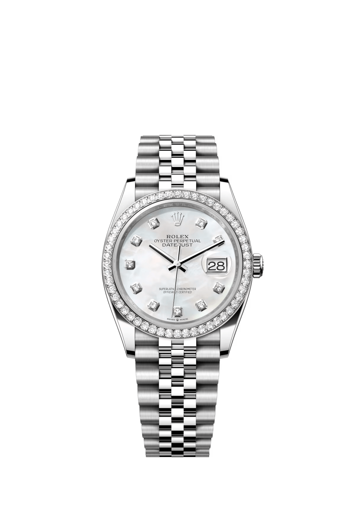 The Oyster Perpetual Datejust 36 in white gold and Oystersteel with a diamond-set white mother-of-pearl dial and a Jubilee bracelet. -m126284rbr-0011