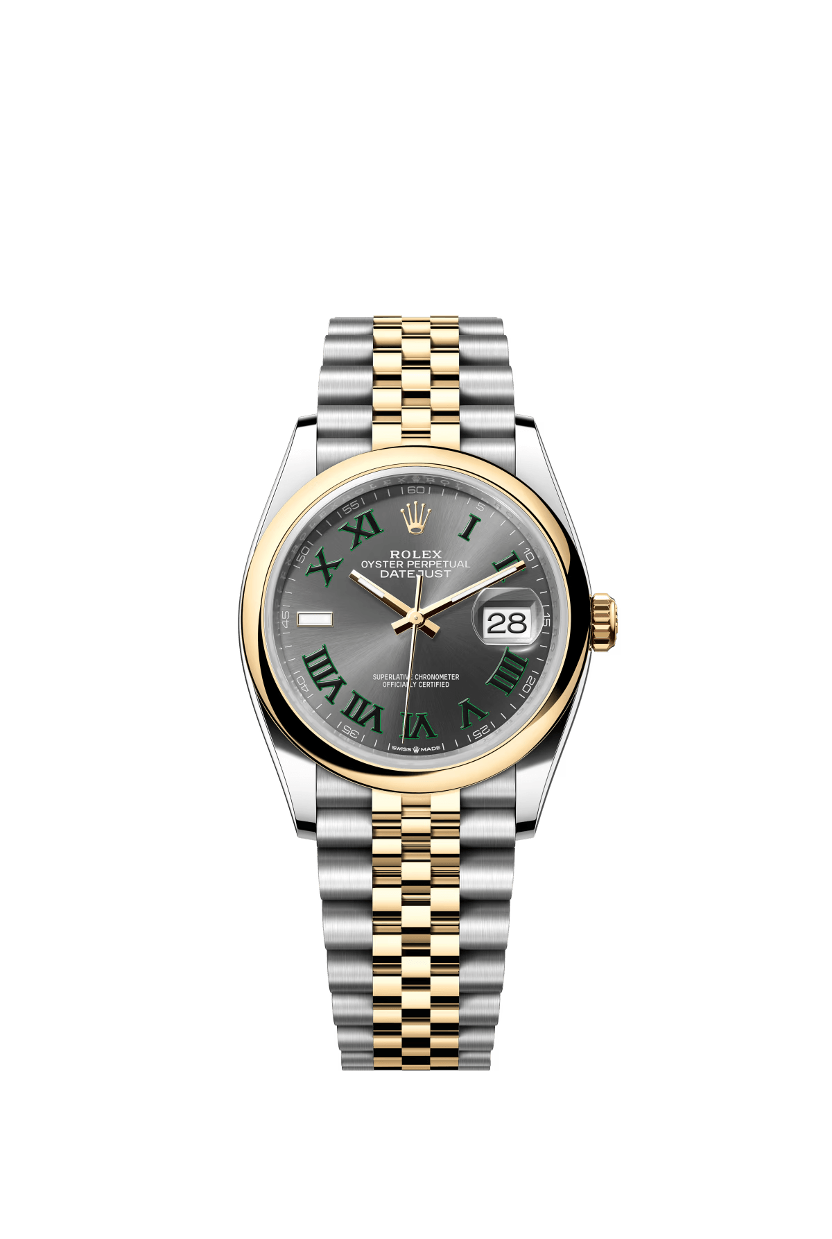 The Oyster Perpetual Datejust 36 is available in yellow gold and Oystersteel with a slate-grey dial and a Jubilee bracelet. -m126203-0035