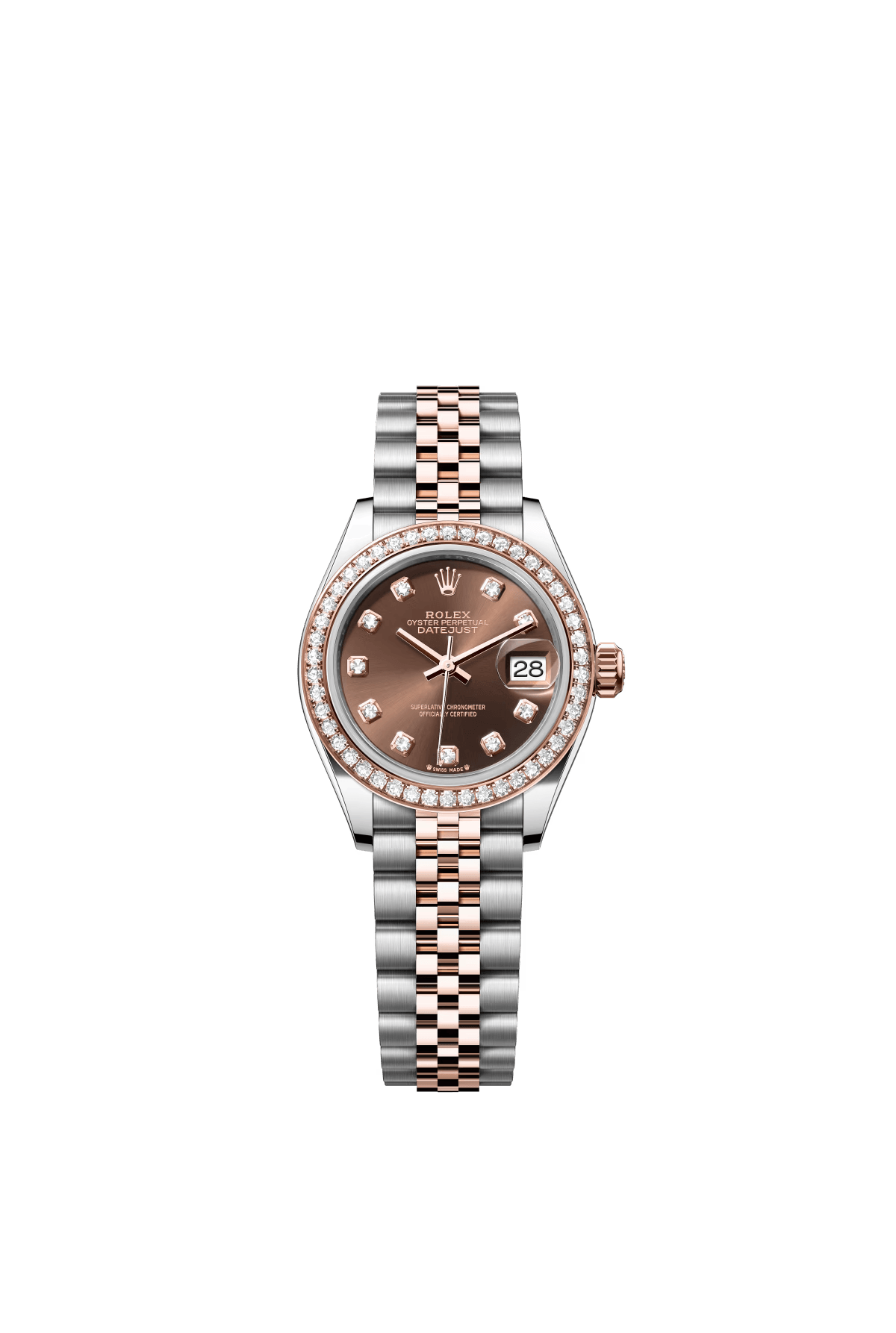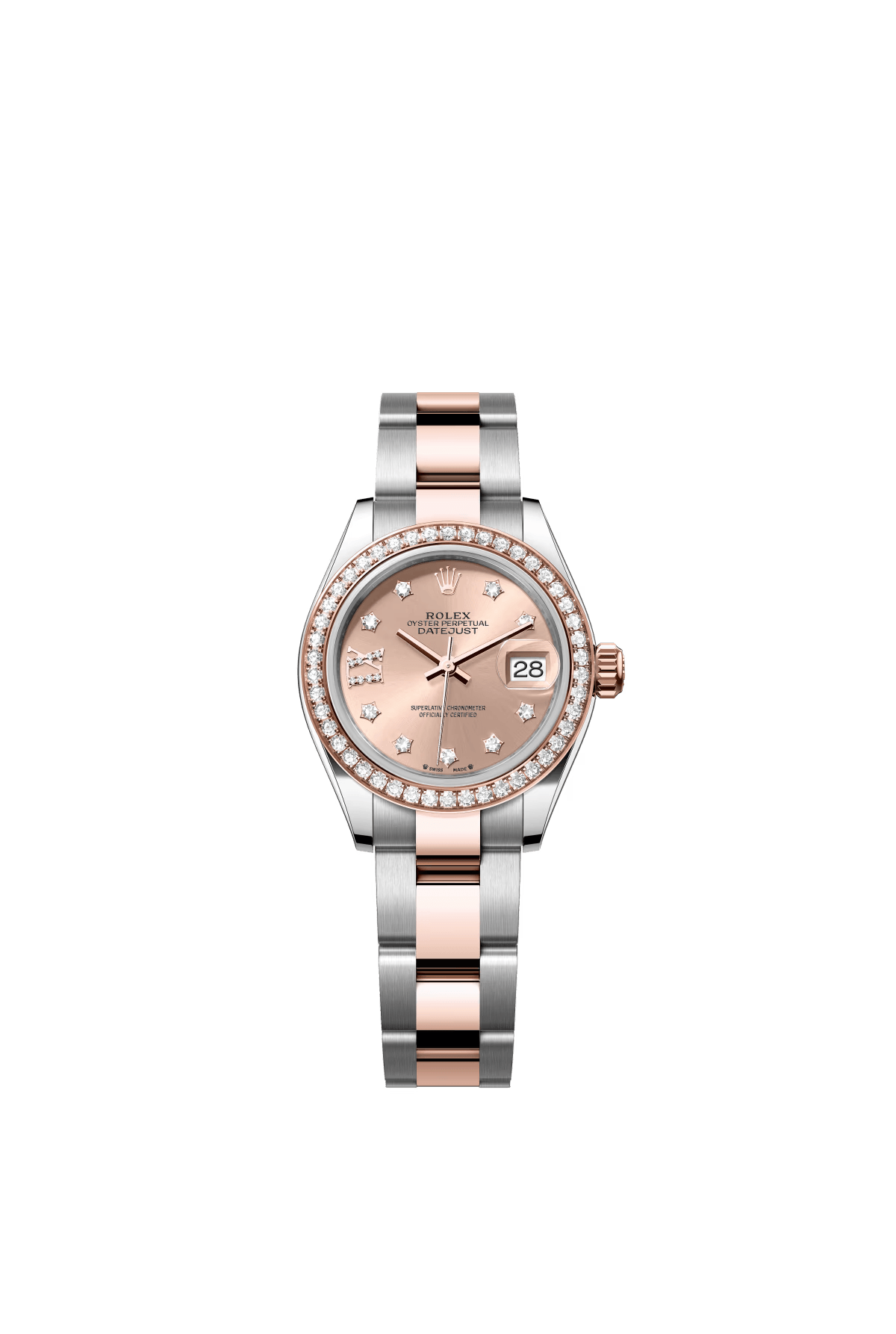 The Oyster Perpetual Lady-Datejust is available in Everose gold and Oystersteel. with a rose gold-tone dial set with diamonds and an Oyster bracelet. -m279381rbr-0028 28mm