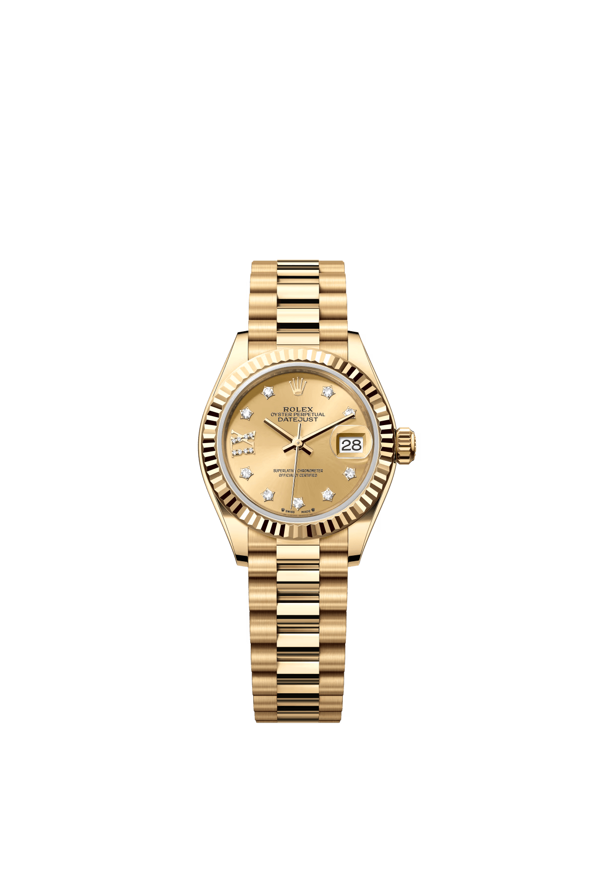 The Oyster Perpetual Lady-Datejust in 18 ct yellow gold with a diamond-set champagne dial and a President bracelet. -m279178-0013 28mm