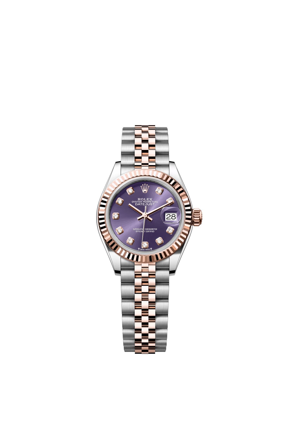 The Oyster Perpetual Lady-Datejust in Everose gold and Oystersteel is presented with a diamond-set eggplant purple dial and a Jubilee bracelet. -m279171-0015 28mm