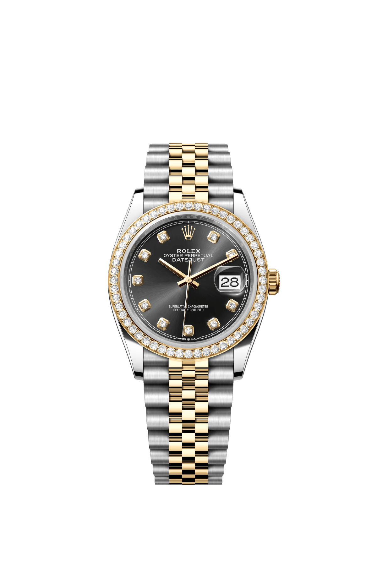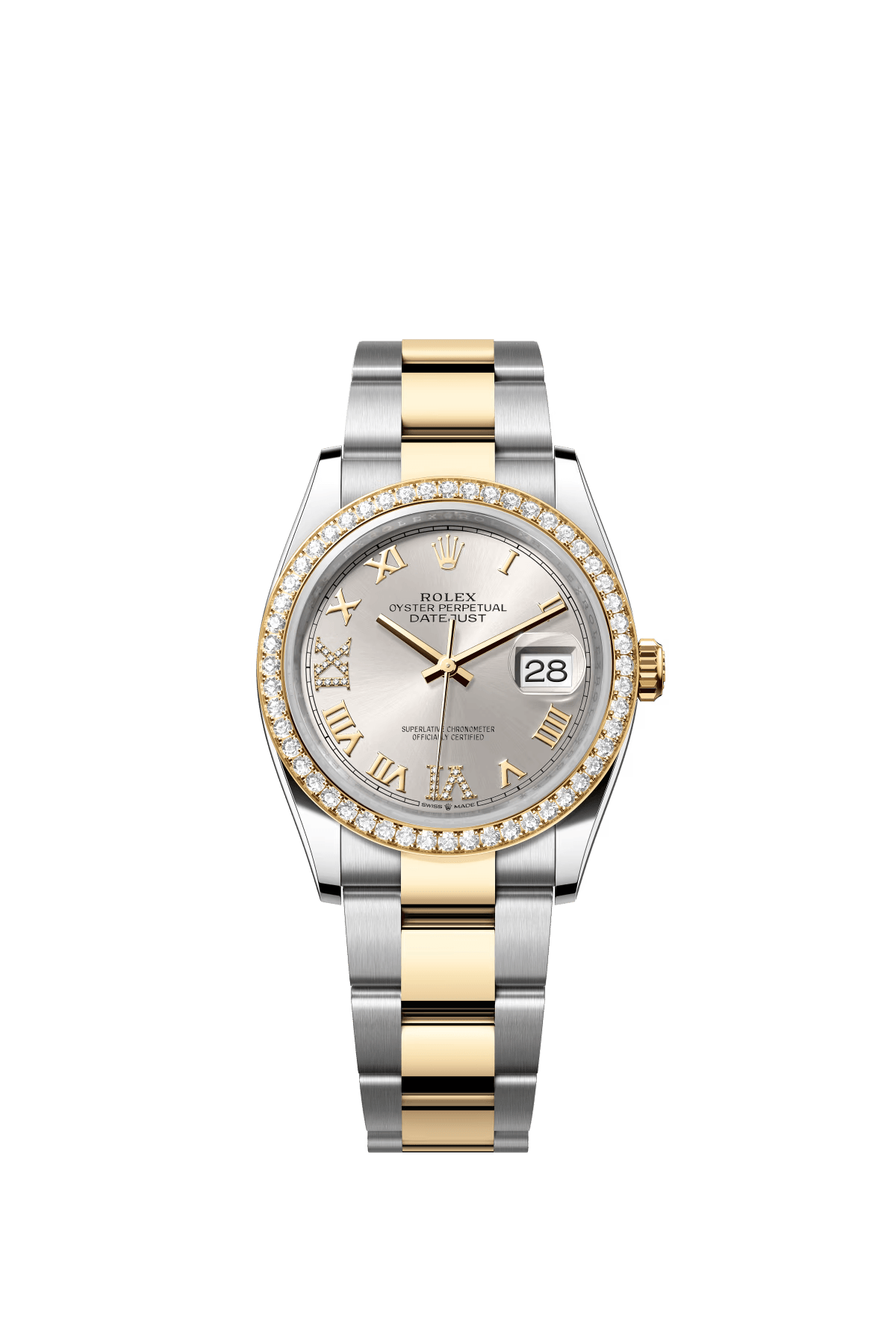 The Oyster Perpetual Datejust 36 is available in yellow gold and Oysteel with a diamond-set silver dial and an Oyster bracelet. -m126283rbr-0018