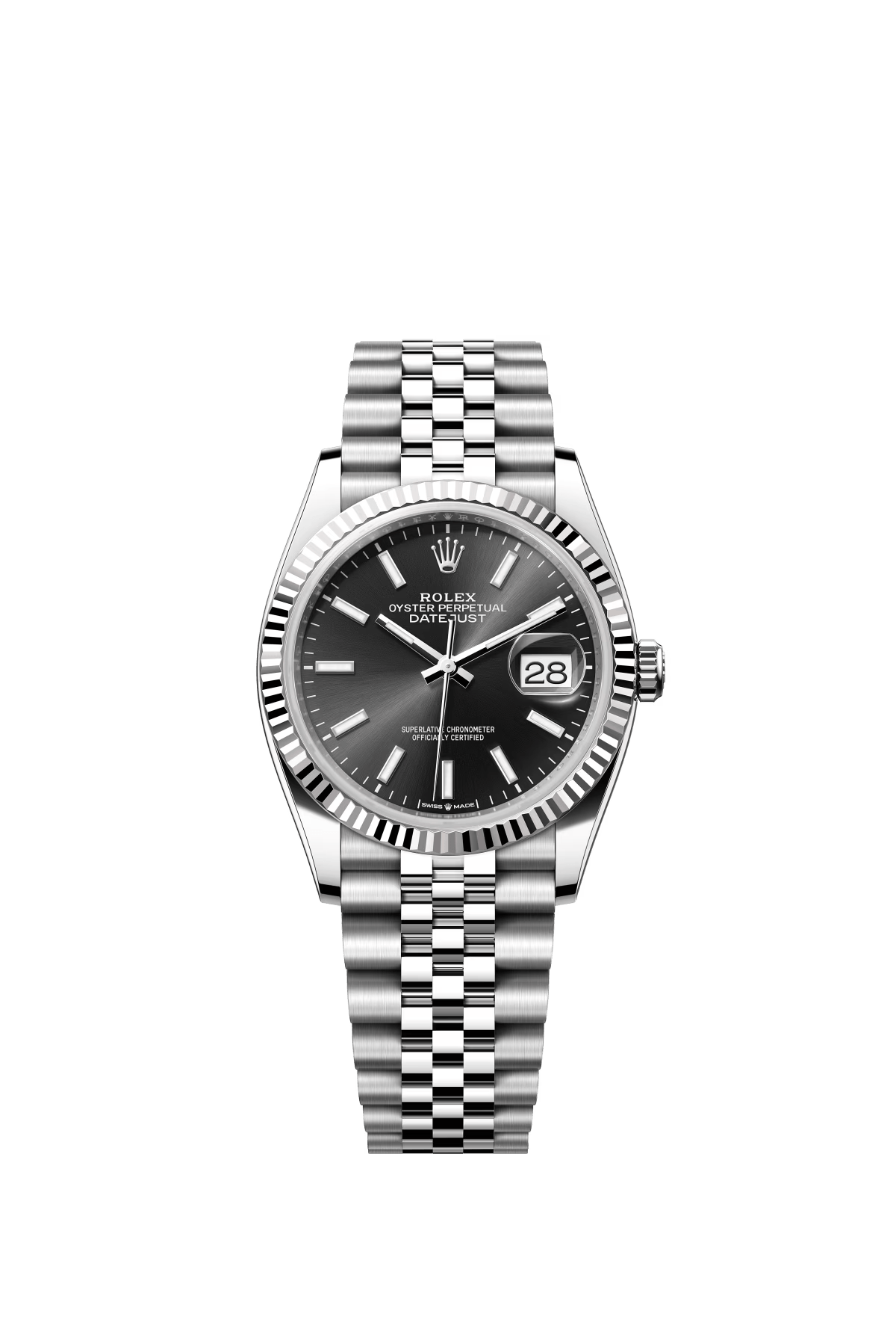 The Oyster Perpetual Datejust 36 is available in white gold and Oystersteel with a glossy black dial and a Jubilee bracelet. -m126234-0015