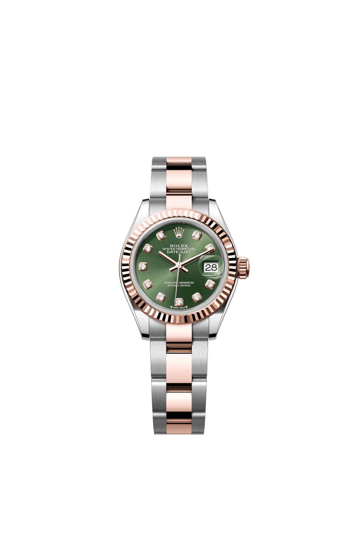 The Oyster Perpetual Lady-Datejust in Everose gold and Oystersteel with a diamond-set olive green dial and an Oyster bracelet. -m279171-0008 28mm