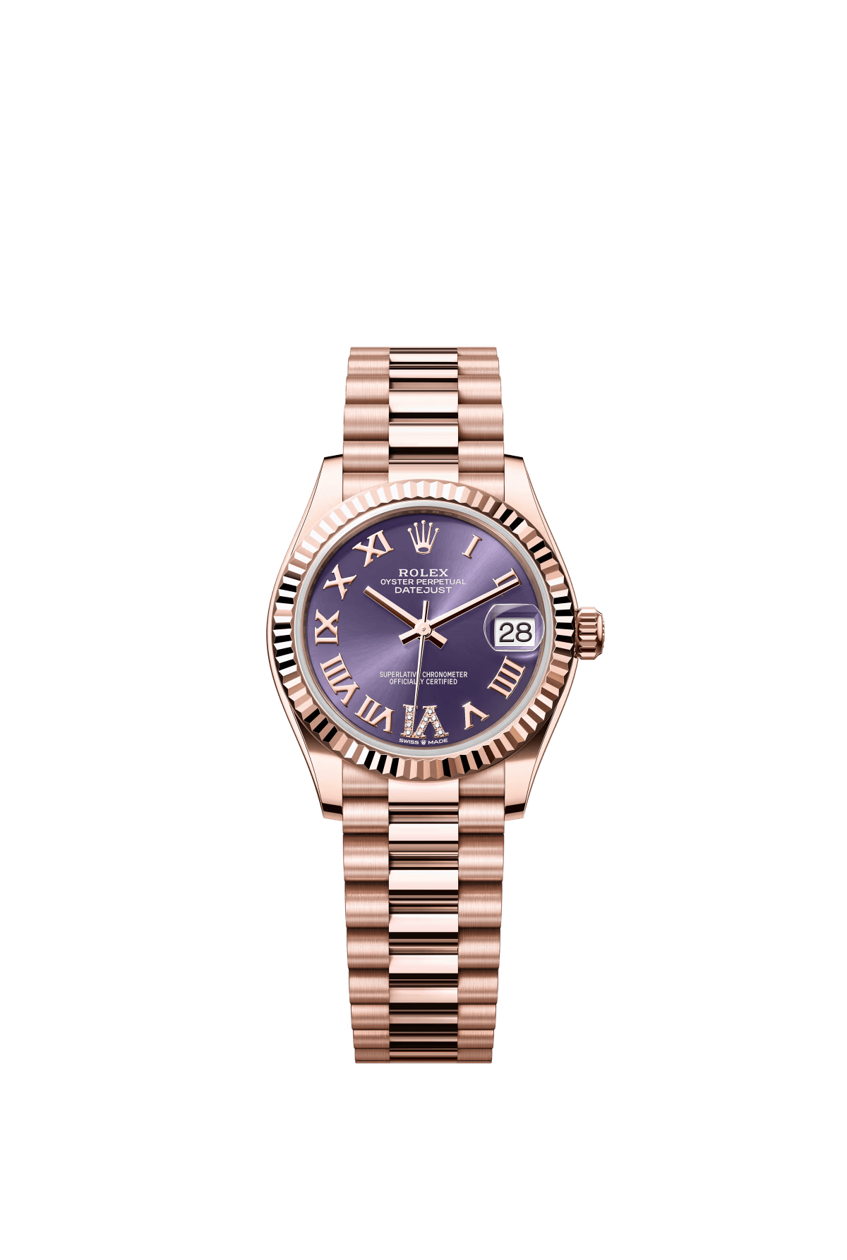 The Oyster Perpetual Datejust 31 in 18 ct Everose gold with a diamond-set eggplant purple dial and a President bracelet. -m278275-0029
