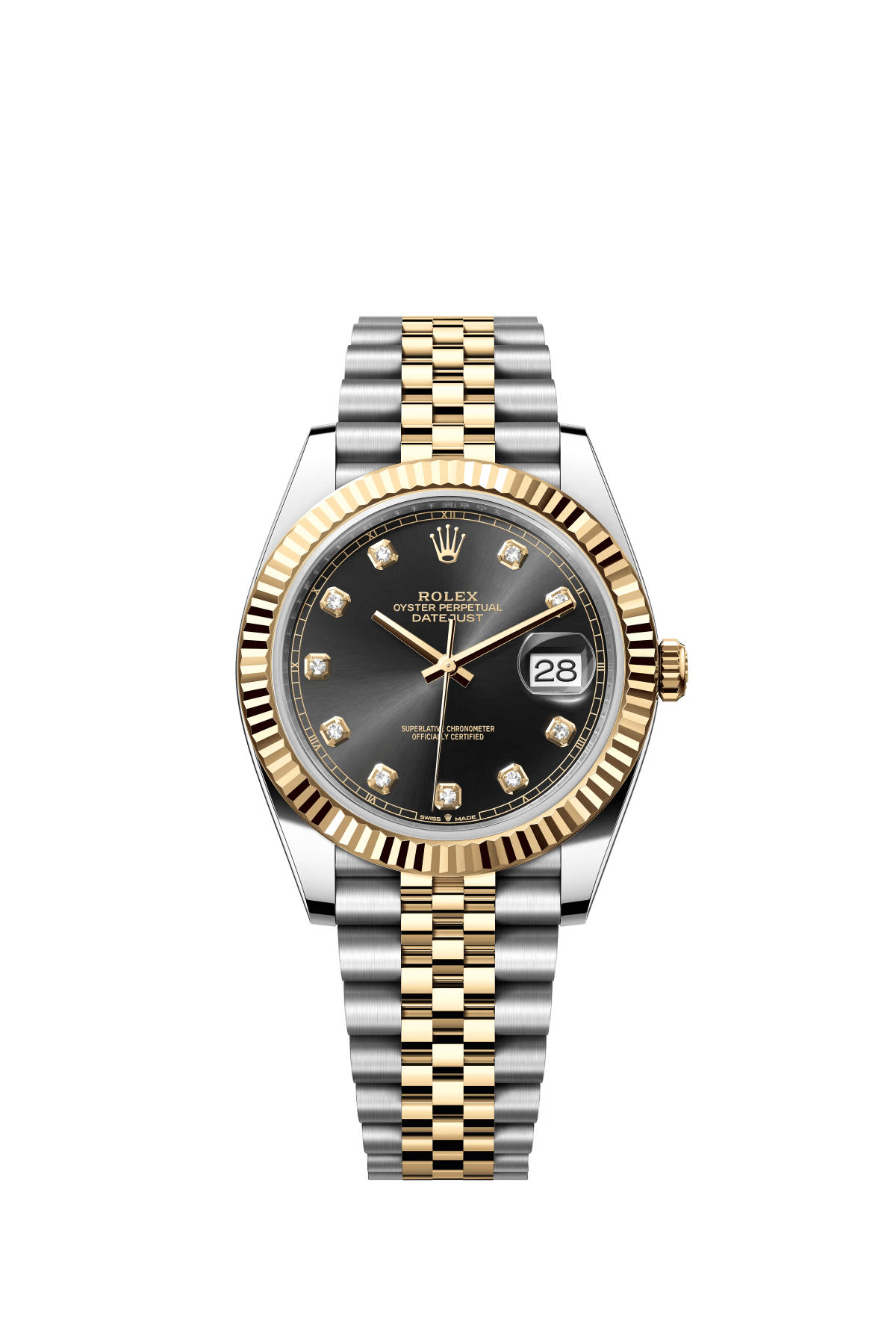The Oyster Perpetual Datejust 41 is available in yellow gold and Oysteel. with a diamond-set glossy black dial and an Oyster bracelet. -m126303-0005