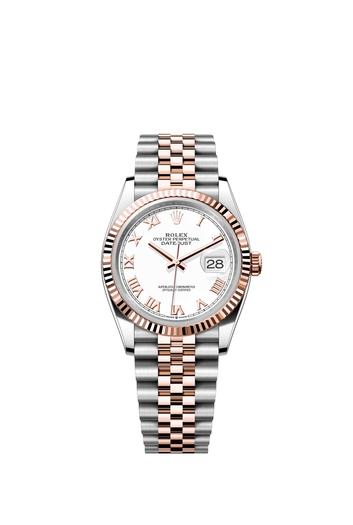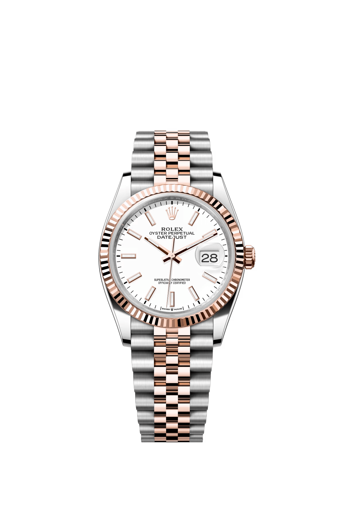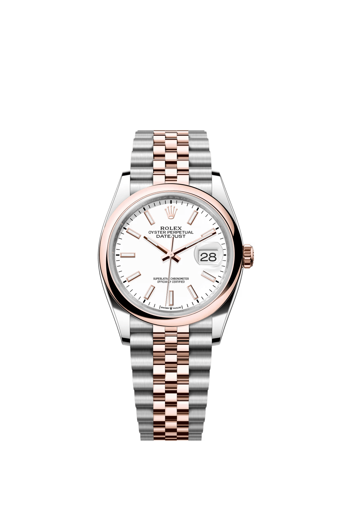 The Oyster Perpetual Datejust 36 is available in Everose gold and Oystersteel with a white dial and a Jubilee bracelet. -m126231-0015