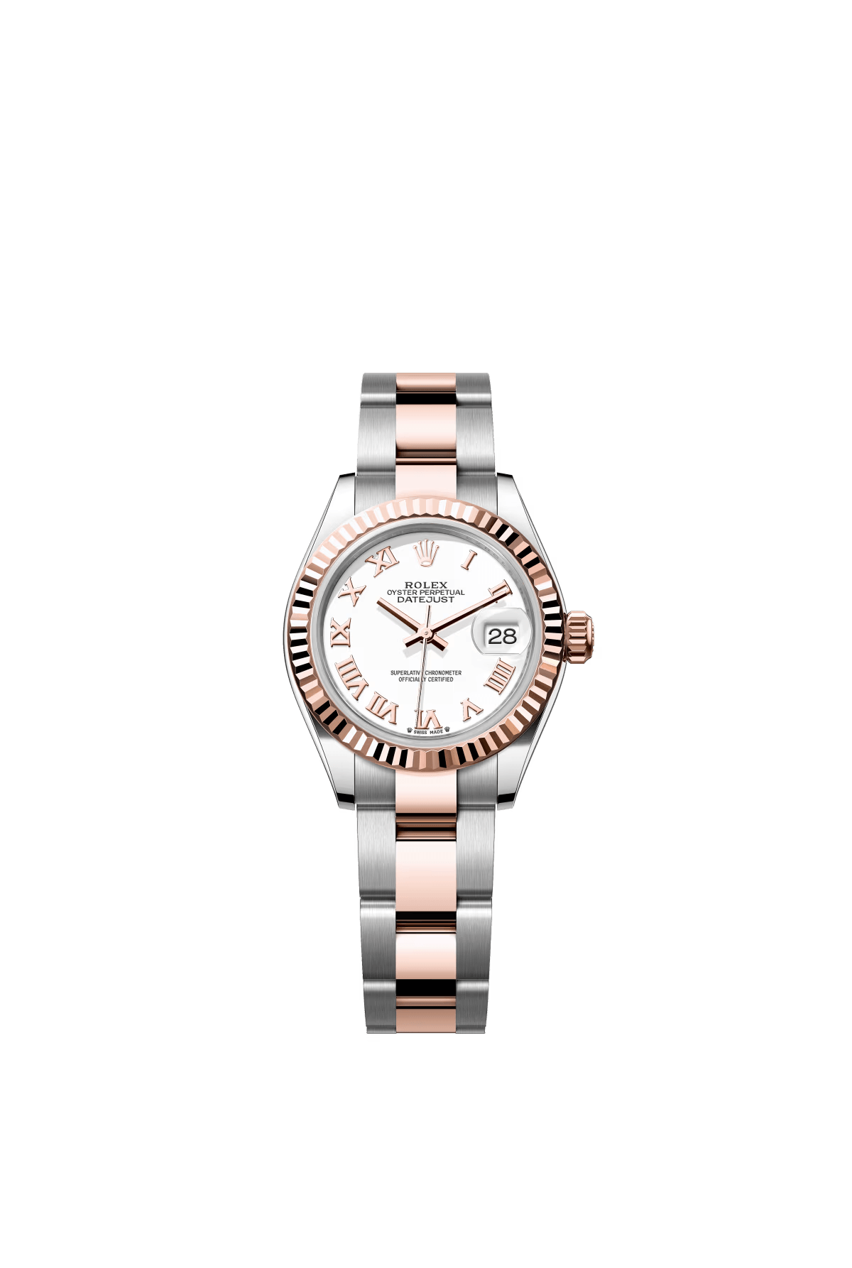 The Oyster Perpetual Lady-Datejust is available in Everose gold and Oystersteel with a white dial and Oyster bracelet. -m279171-0022 28mm