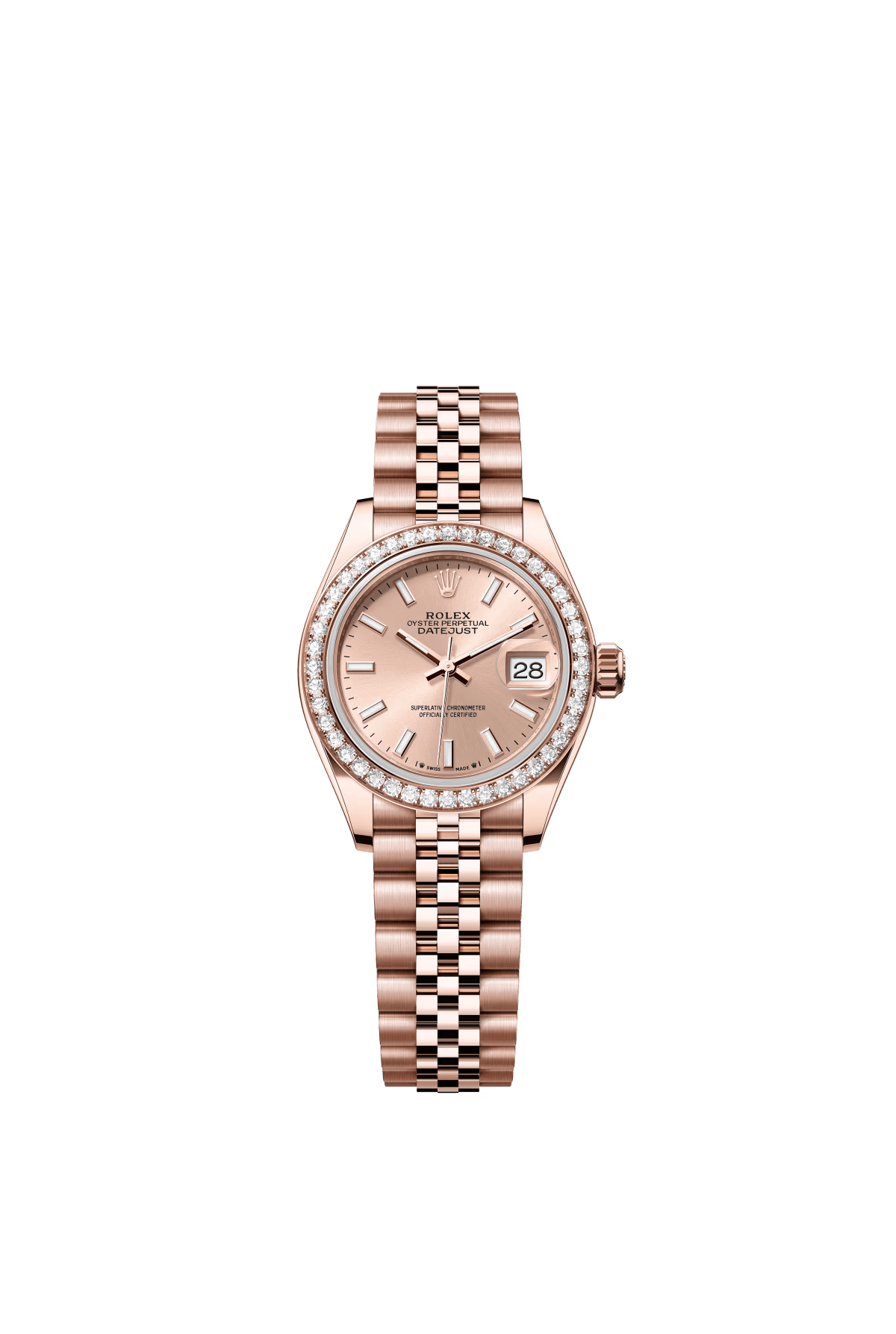 The Oyster Perpetual Lady-Datejust in 18-carat Everose gold with a diamond-set white mother-of-pearl dial and a Jubilee bracelet. -m279135rbr-0019 28mm