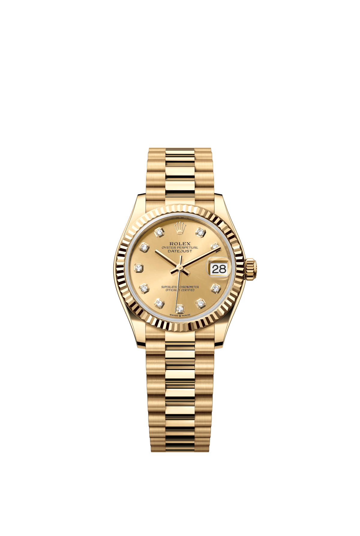 The Oyster Perpetual Datejust 31 in 18 ct yellow gold with a champagne-coloured diamond-set dial and a President bracelet. -m278278-0009