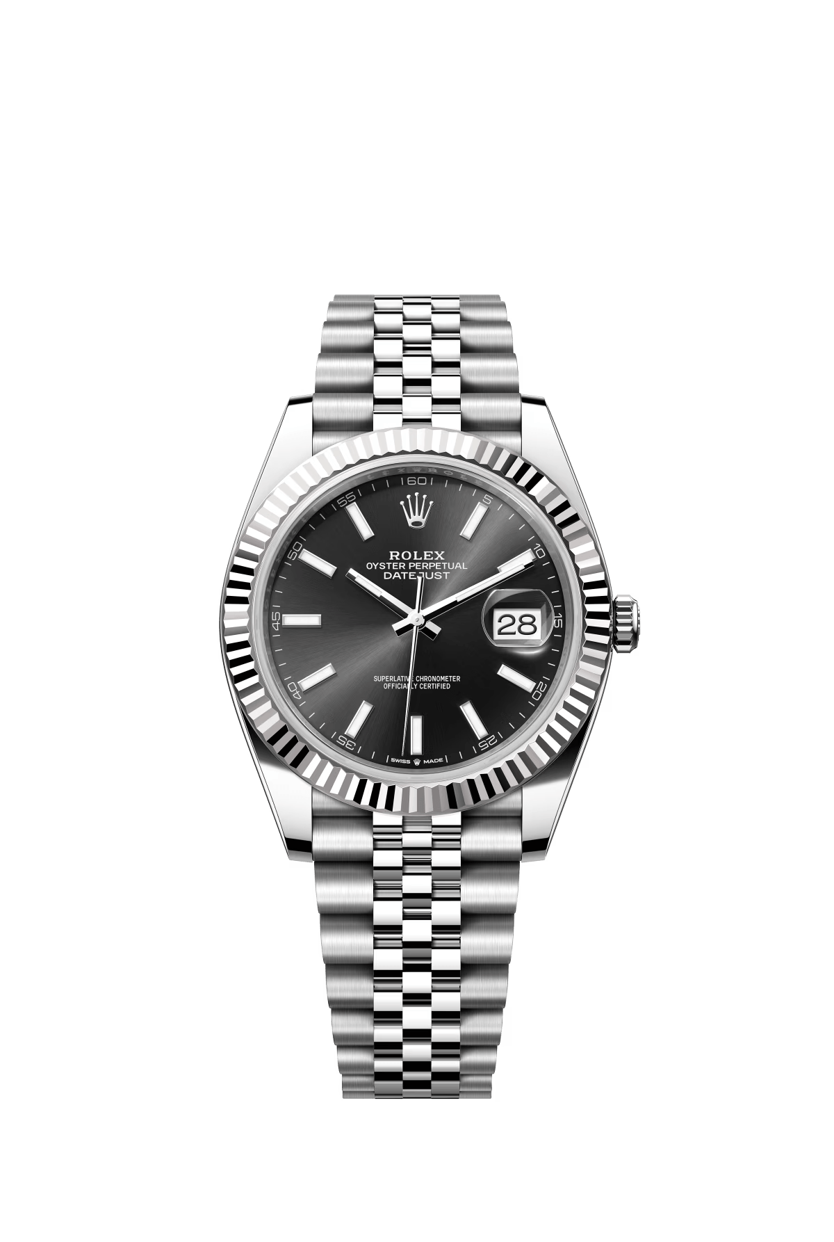 The Oyster Perpetual Datejust 41 is available in white gold and Oystersteel with a glossy black dial and a Jubilee bracelet. -m126334-0018