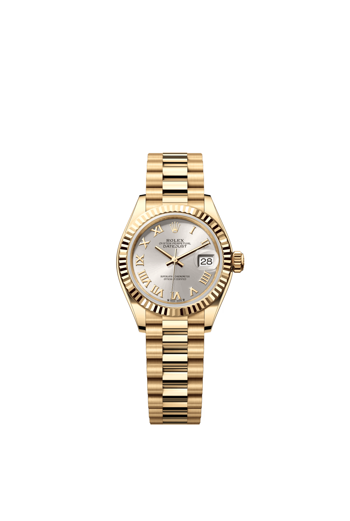 The Oyster Perpetual Lady-Datejust in 18 ct yellow gold with a silver dial and President bracelet. -m279178-0020 28mm