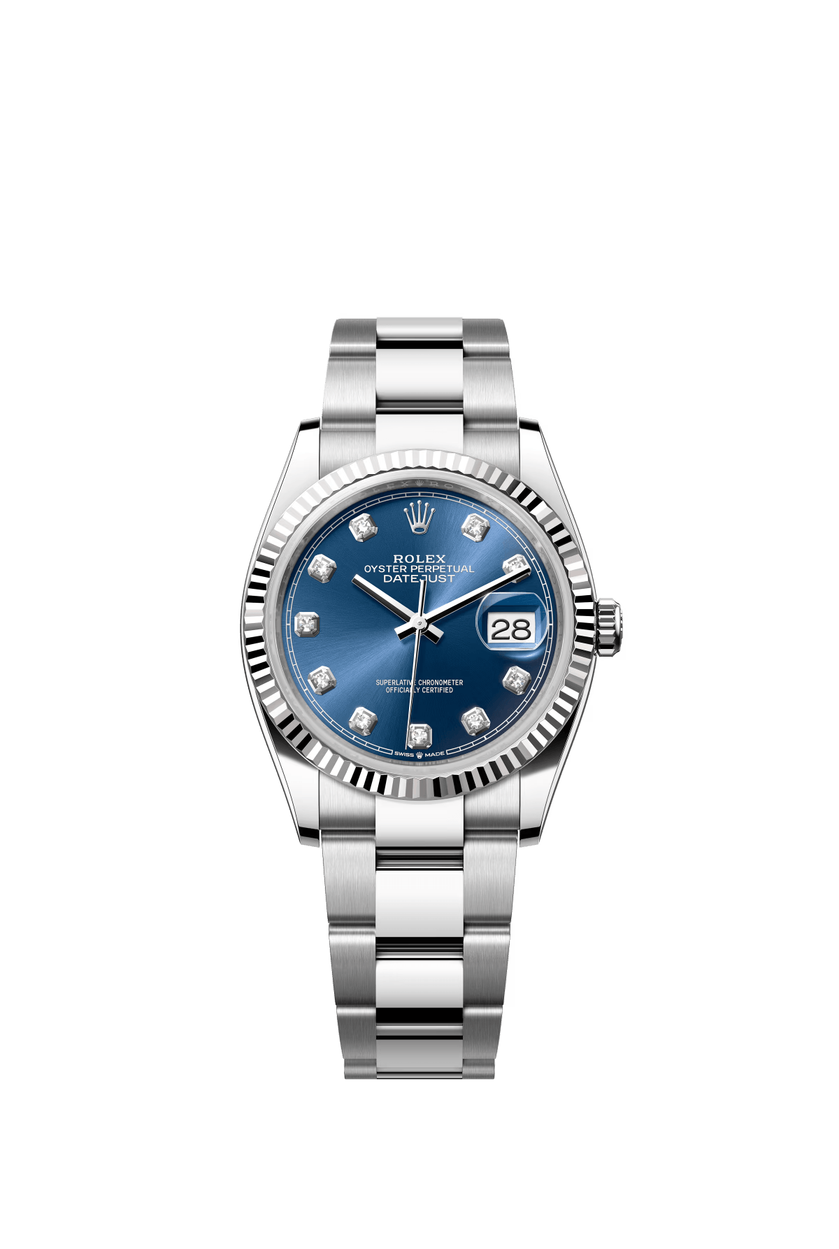 The Oyster Perpetual Datejust 36 is available in white gold and Oysteel. with a brilliant blue diamond-set dial and an Oyster bracelet. -m126234-0038