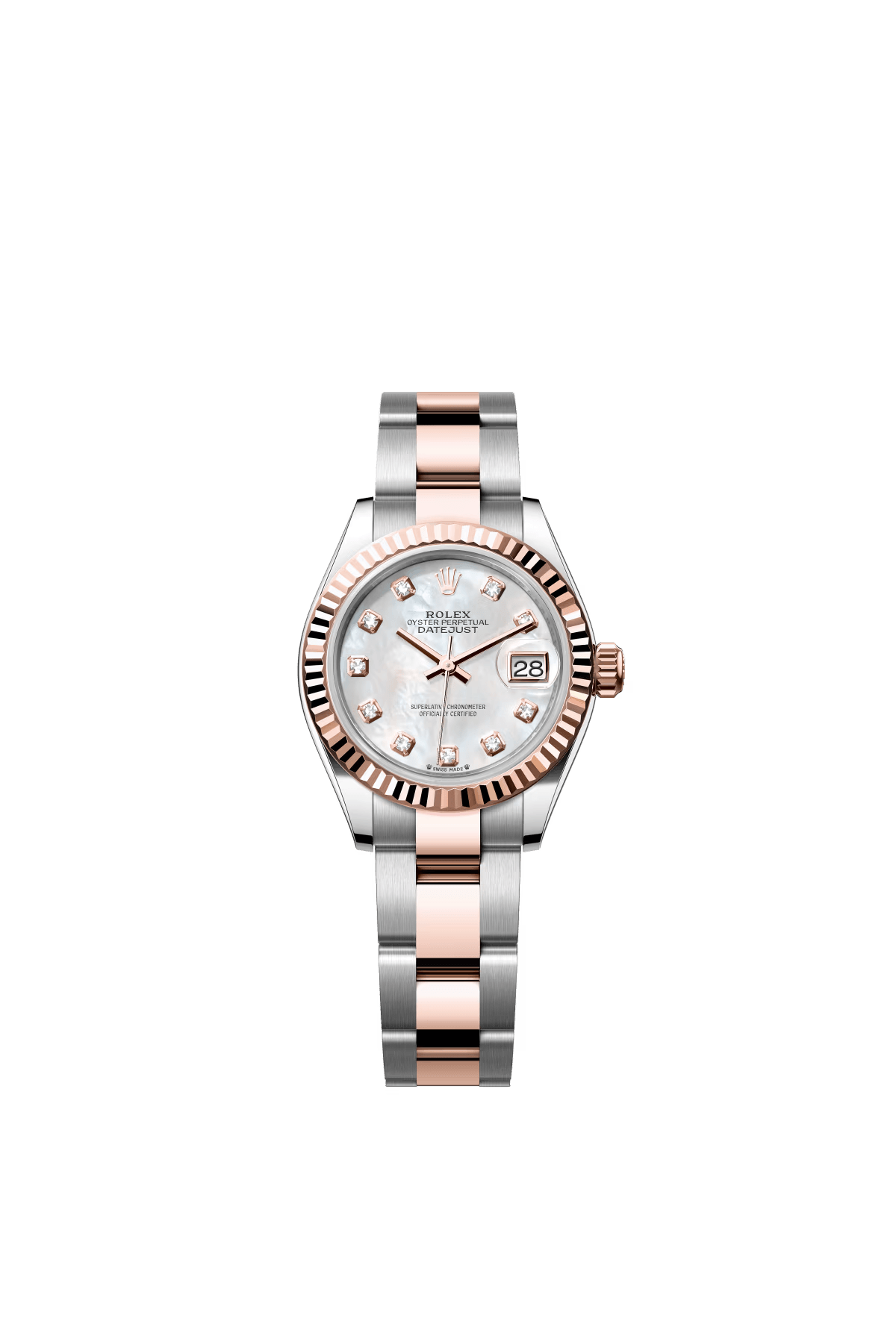 The Oyster Perpetual Lady-Datejust in Everose gold and Oystersteel features a diamond-set white mother-of-pearl dial and an Oyster bracelet. -m279171-0014 28mm