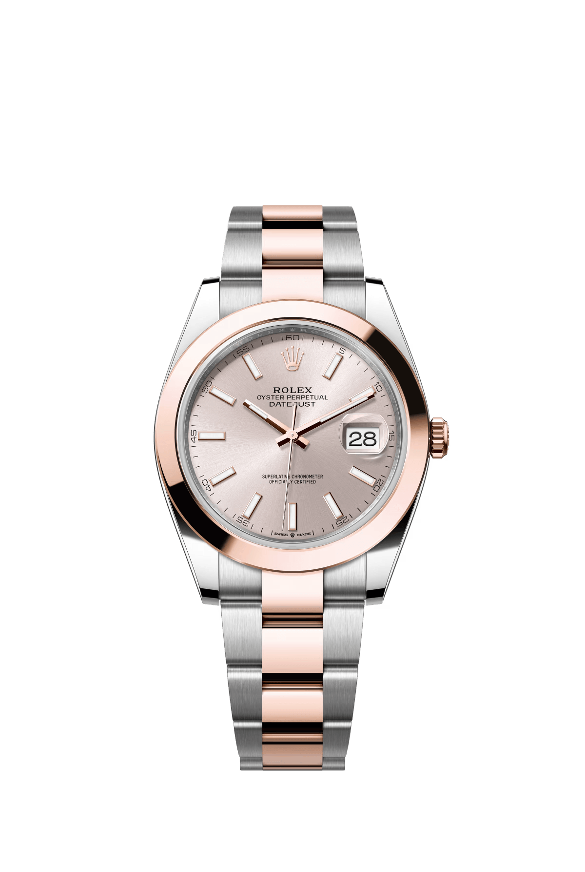 The Oyster Perpetual Datejust 41 is available in Everose gold and Oystersteel with a sunrise gold dial and an Oyster bracelet. -m126301-0009