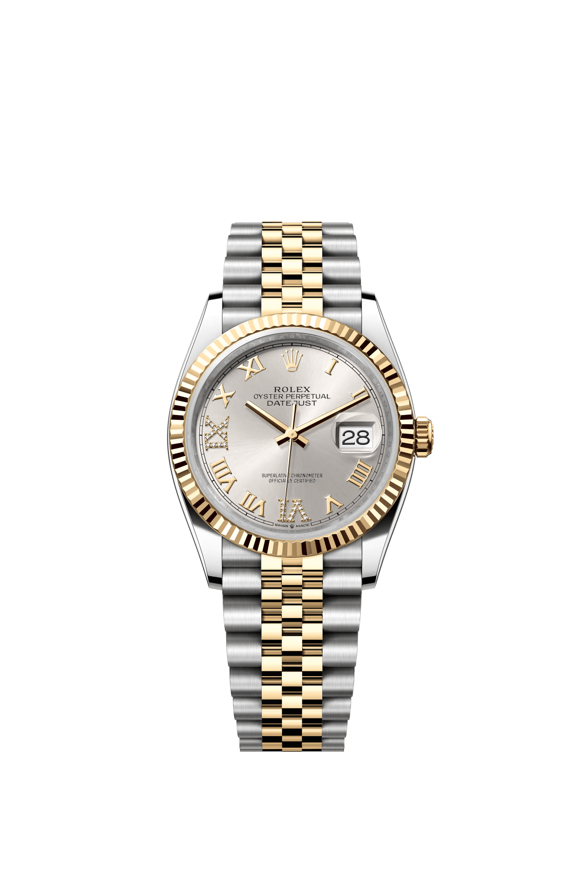 The Oyster Perpetual Datejust 36 is available in yellow gold and Oystersteel with a silver-toned diamond-set dial and a Jubilee bracelet. -m126233-0031