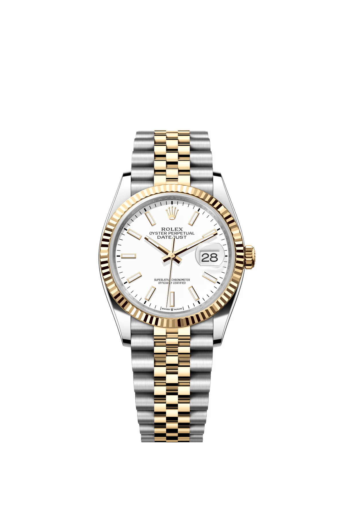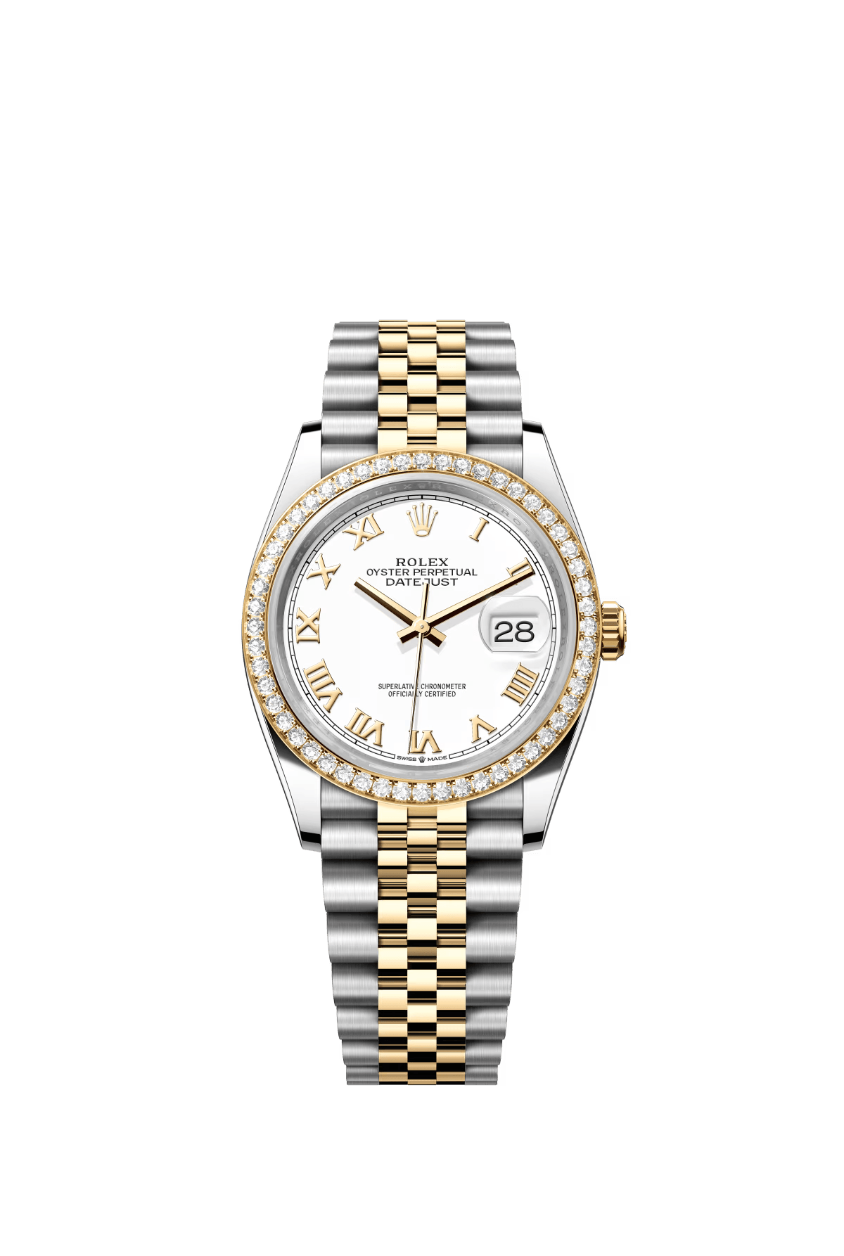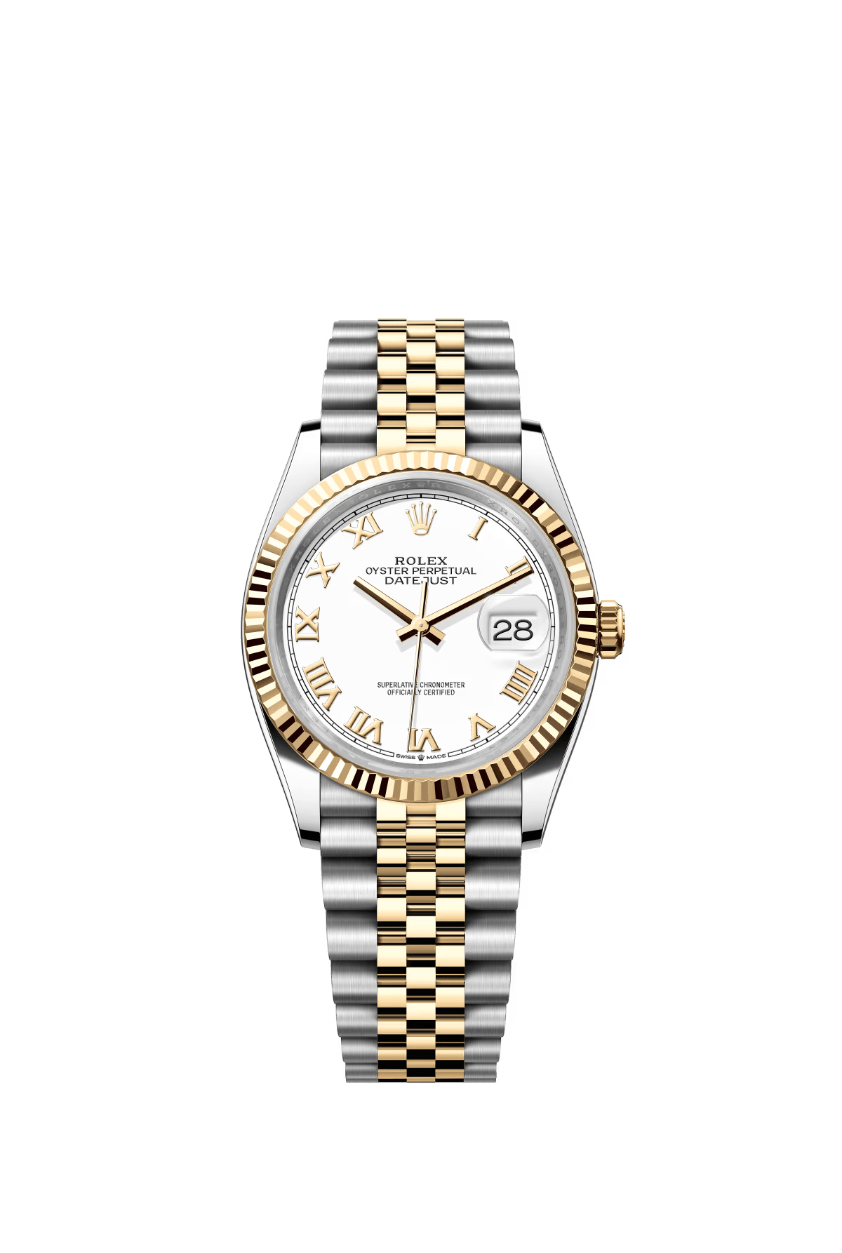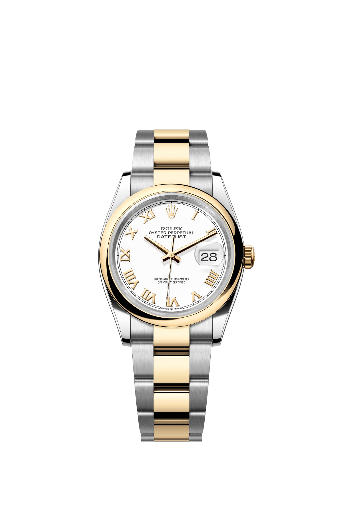 The Oyster Perpetual Datejust 36 is available in yellow gold and Oystersteel with a white dial and Oyster bracelet. -m126203-0030