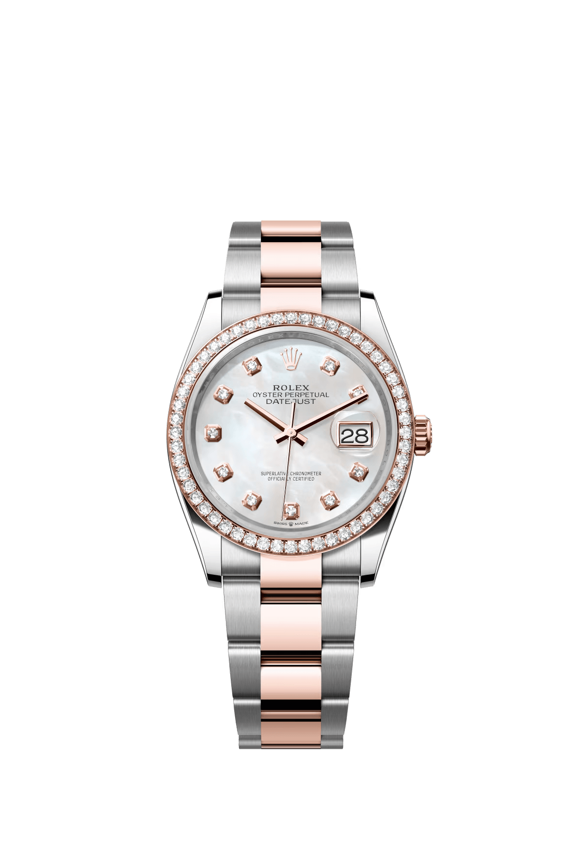 The Oyster Perpetual Datejust 36 is available in Everose gold and Oystersteel. with a diamond-set white mother-of-pearl dial and an Oyster bracelet. -m126281rbr-0010