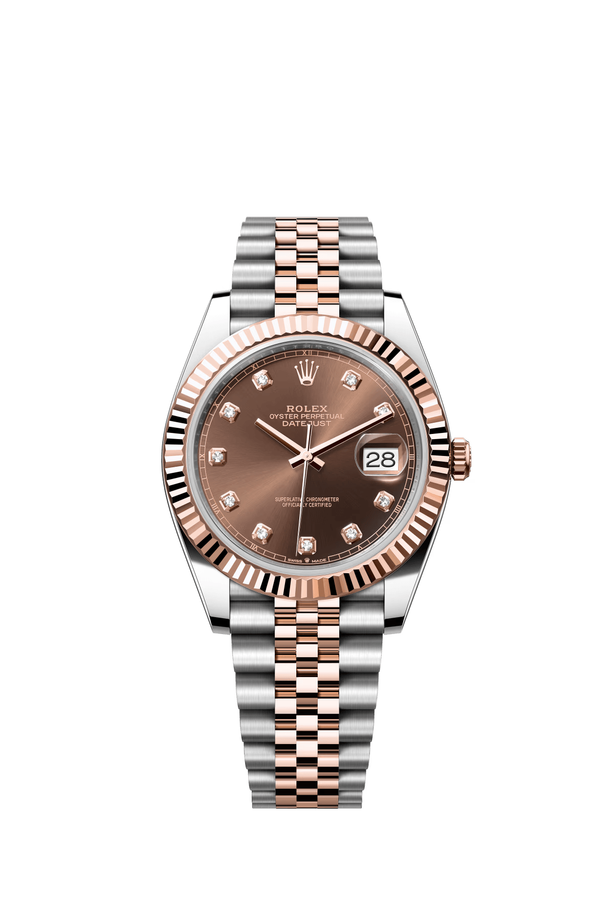 The Oyster Perpetual Datejust 41 is available in Everose gold and Oystersteel with a chocolate-coloured diamond-set dial and a Jubilee bracelet. -m126331-0004