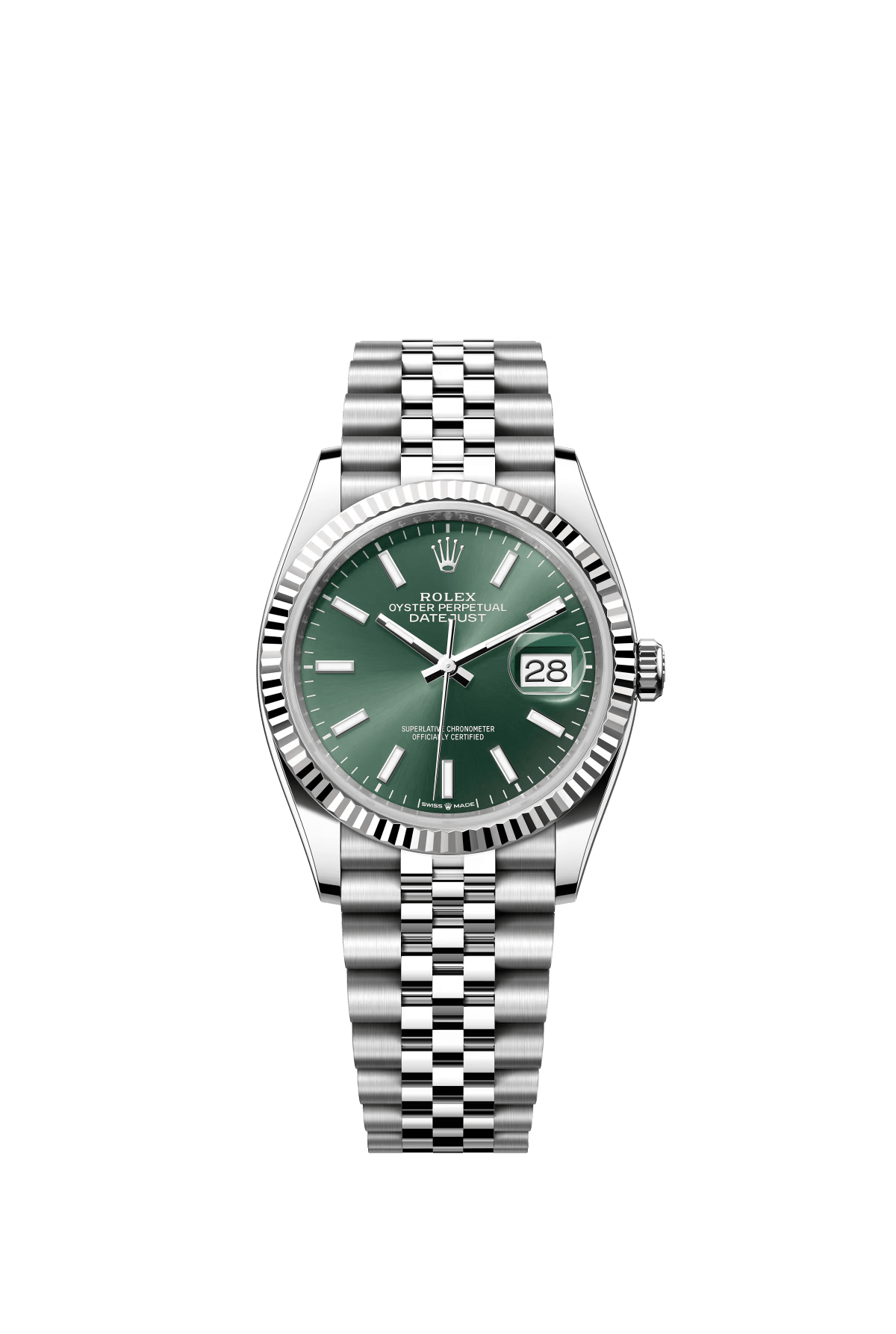 The Oyster Perpetual Datejust 36 is available in white gold and Oystersteel with a mint green dial and a Jubilee bracelet. -m126234-0051
