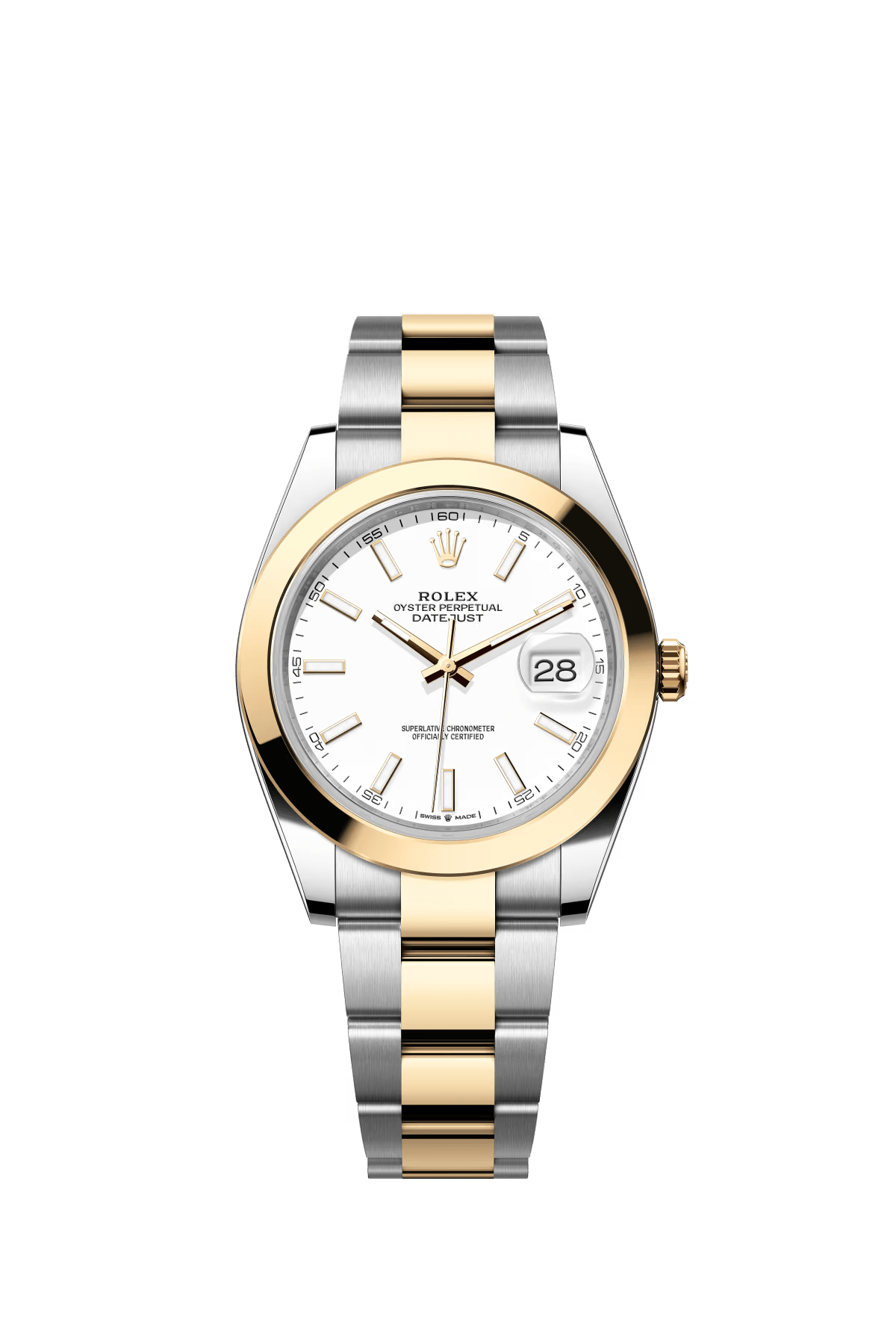 The Oyster Perpetual Datejust 41 is available in yellow gold and Oystersteel with a white dial and an Oyster bracelet. -m126303-0015