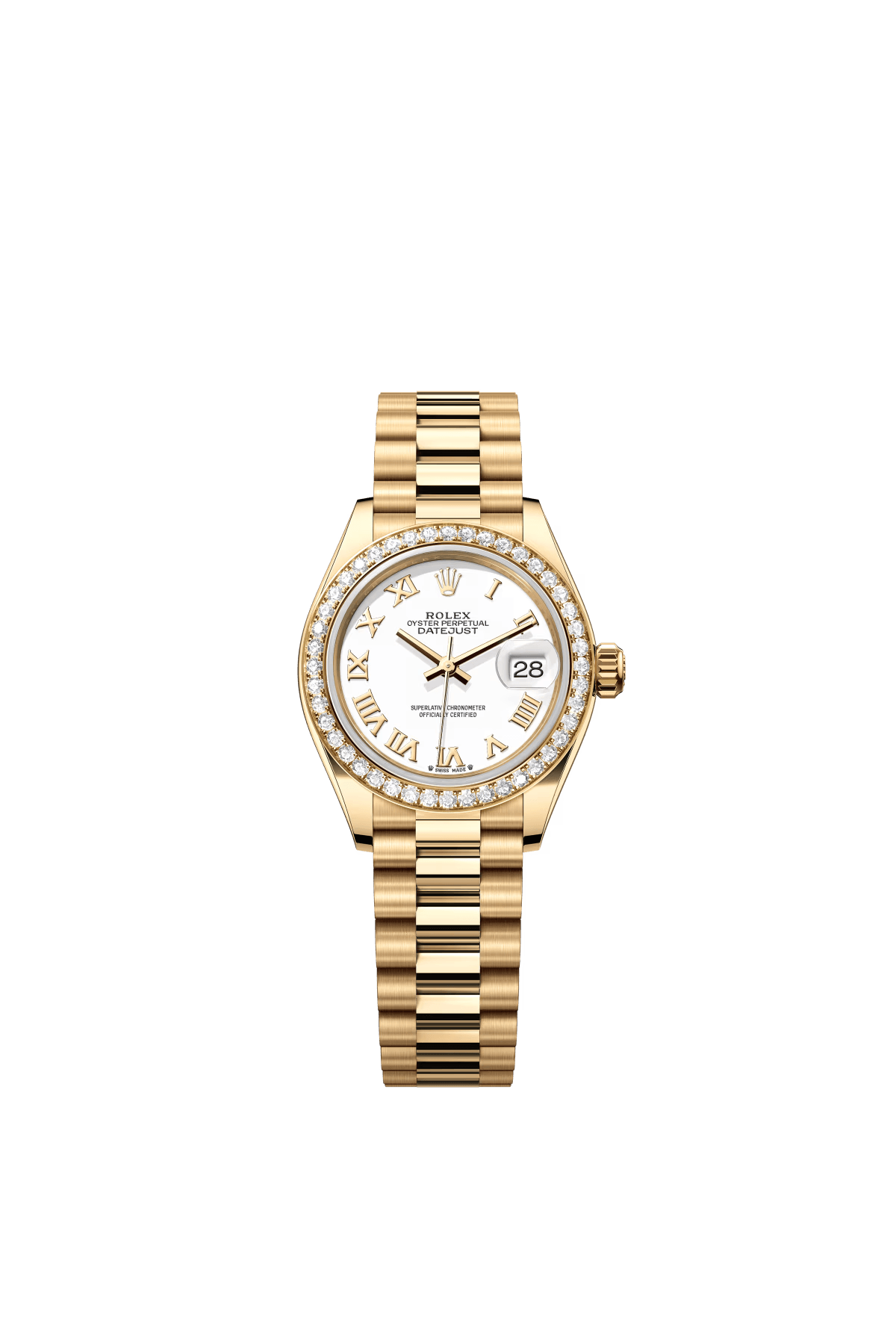 The Oyster Perpetual Lady-Datejust in 18 ct yellow gold with a white dial and President bracelet. -m279138rbr-0031 28mm