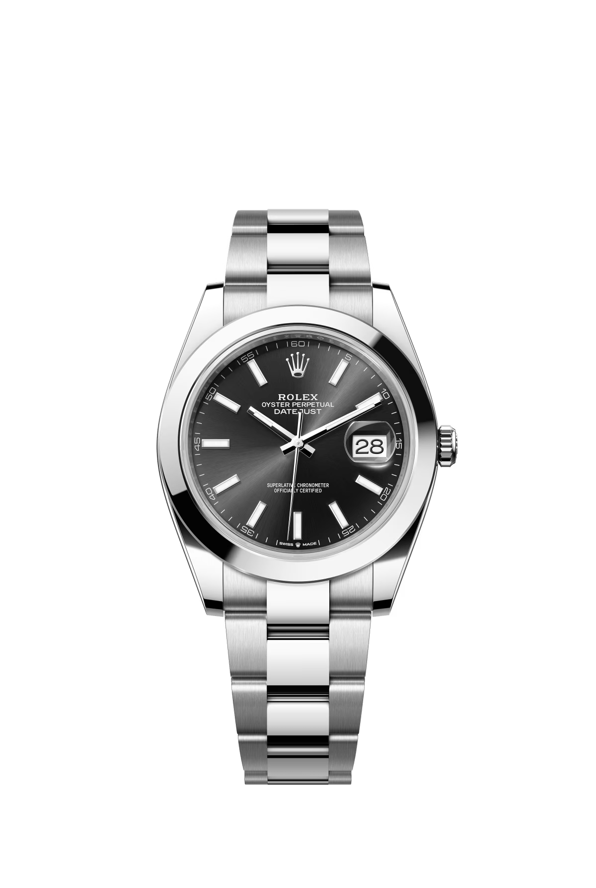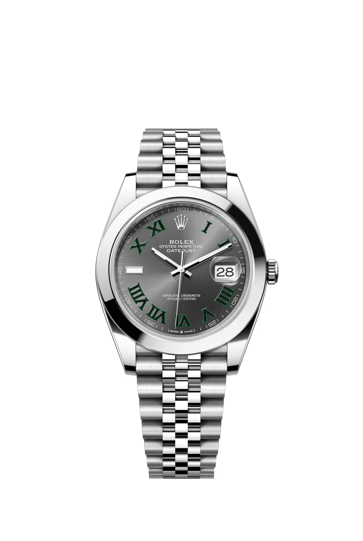 The Oyster Perpetual Datejust 41 is available in Oyster steel with a slate grey dial and a Jubilee bracelet. -m126300-0014