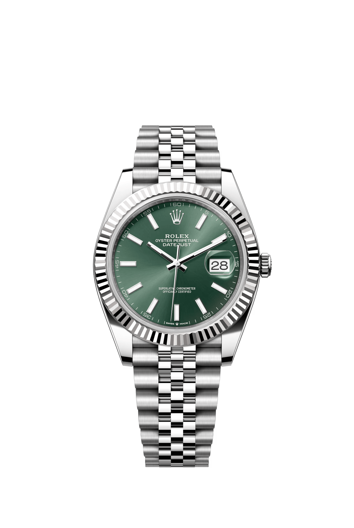 The Oyster Perpetual Datejust 41 is available in white gold and Oystersteel with a mint green dial and a Jubilee bracelet. -m126334-0028