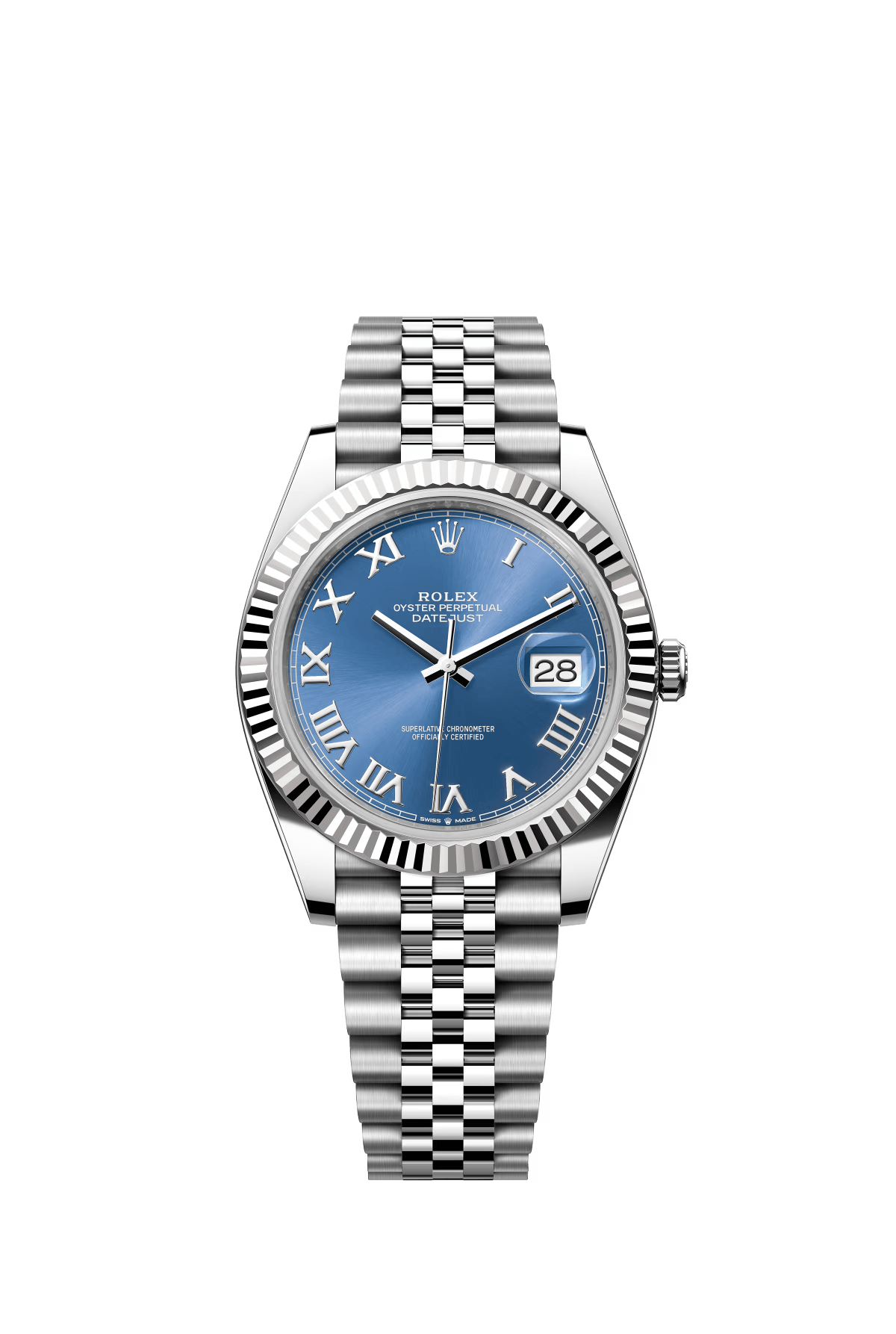 The Oyster Perpetual Datejust 41 is available in white gold and Oystersteel with a sky-blue dial and a Jubilee bracelet. -m126334-0026