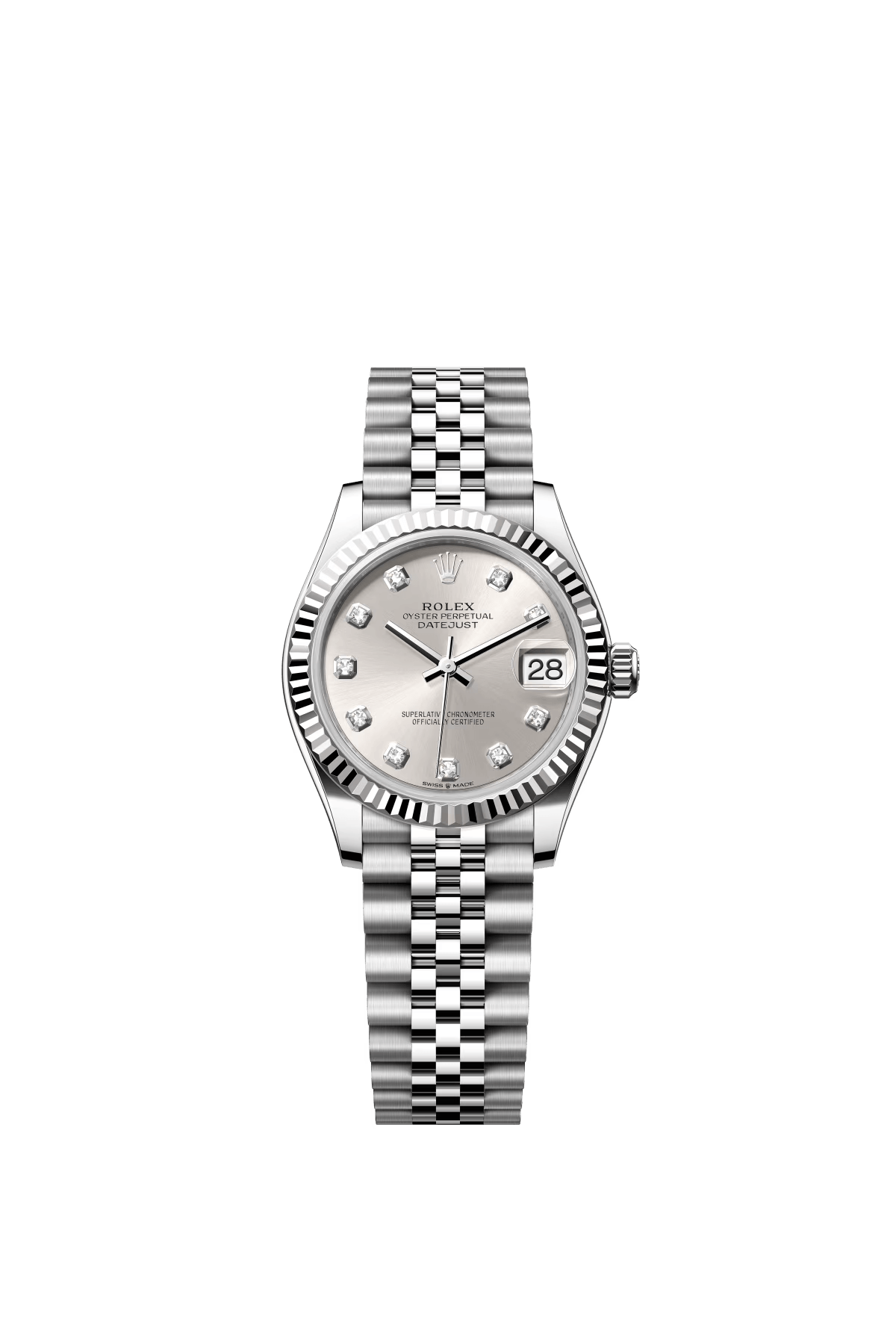The Oyster Perpetual Datejust 31 is available in white gold and Oystersteel. with a diamond-set silver dial and a Jubilee bracelet. -m278274-0030