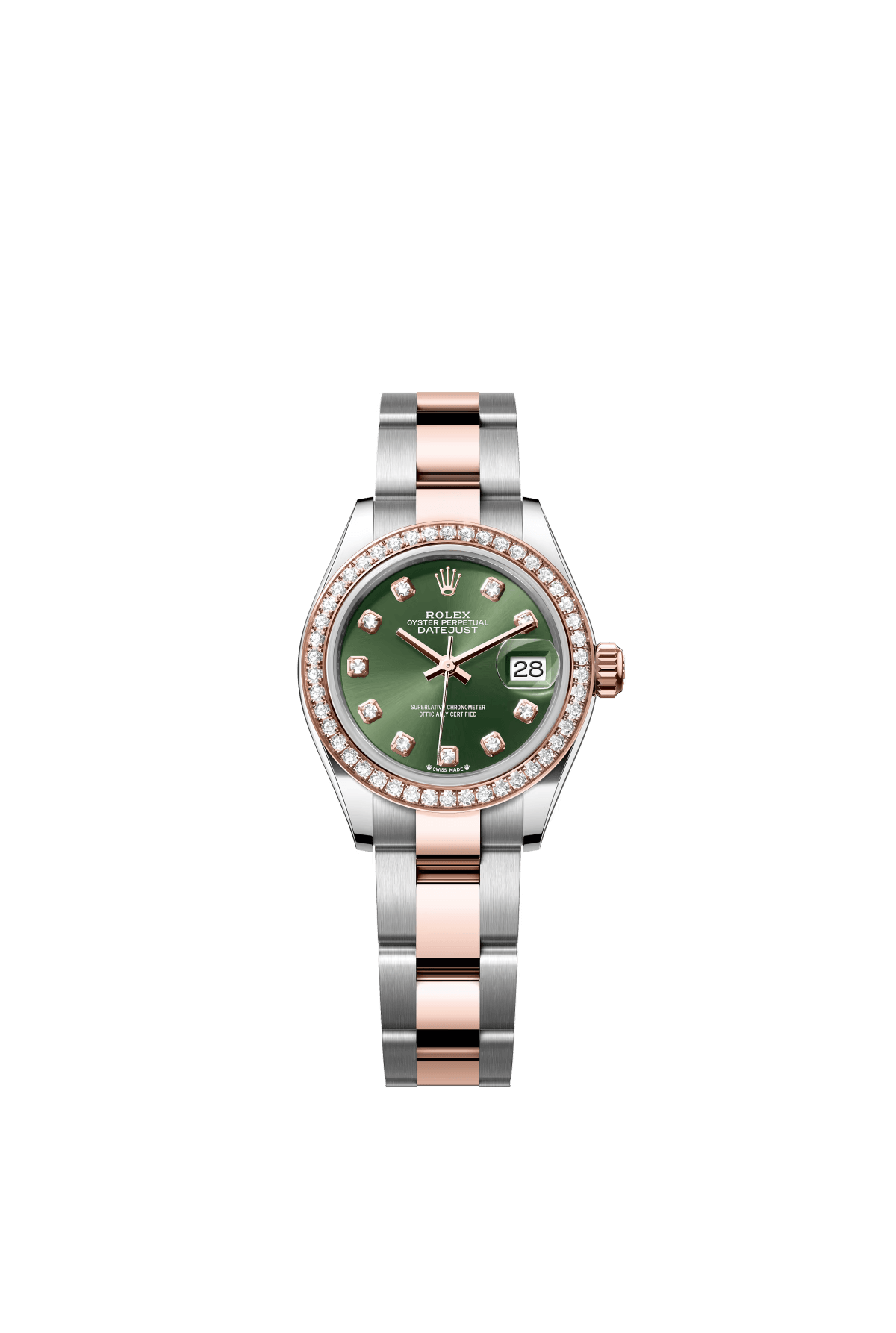 The Oyster Perpetual Lady-Datejust in Everose gold and Oystersteel with a diamond-set olive green dial and an Oyster bracelet. -m279381rbr-0008 28mm