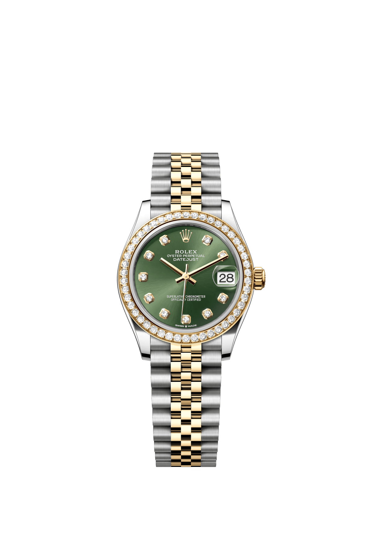 The Oyster Perpetual Datejust 31 in yellow gold and Oystersteel with a diamond-set olive green dial and a Jubilee bracelet. -m278383rbr-0030