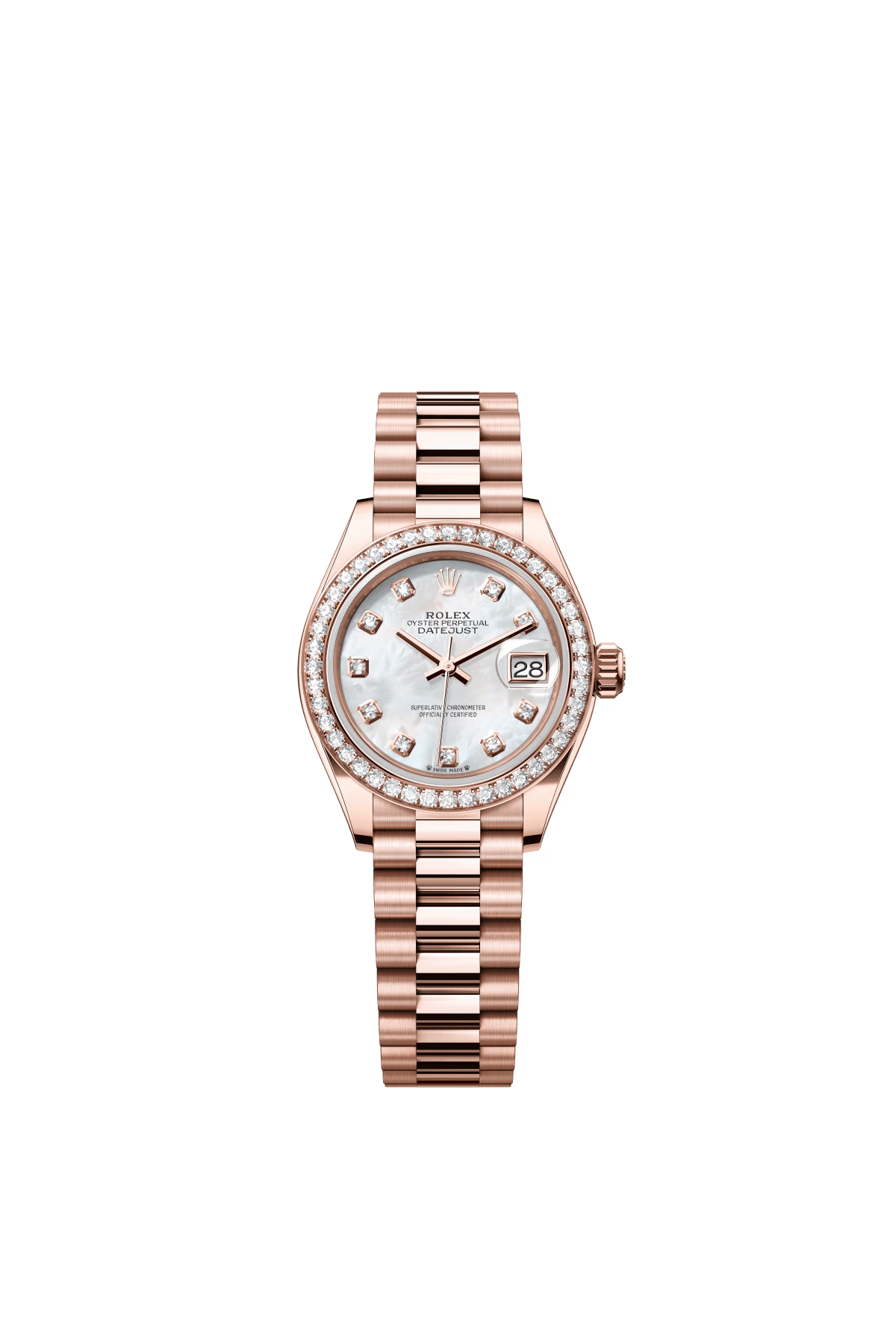 The Oyster Perpetual Lady-Datejust in 18 ct Everose gold with a diamond-set white mother-of-pearl dial and a President bracelet. -m279135rbr-0010 28mm