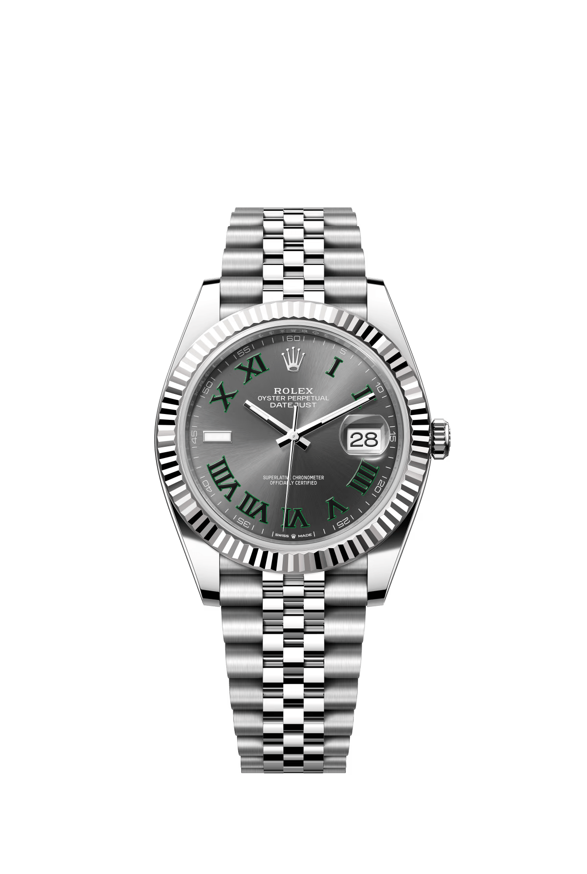 The Oyster Perpetual Datejust 41 is available in white gold and Oystersteel with a slate grey dial and a Jubilee bracelet. -m126334-0022
