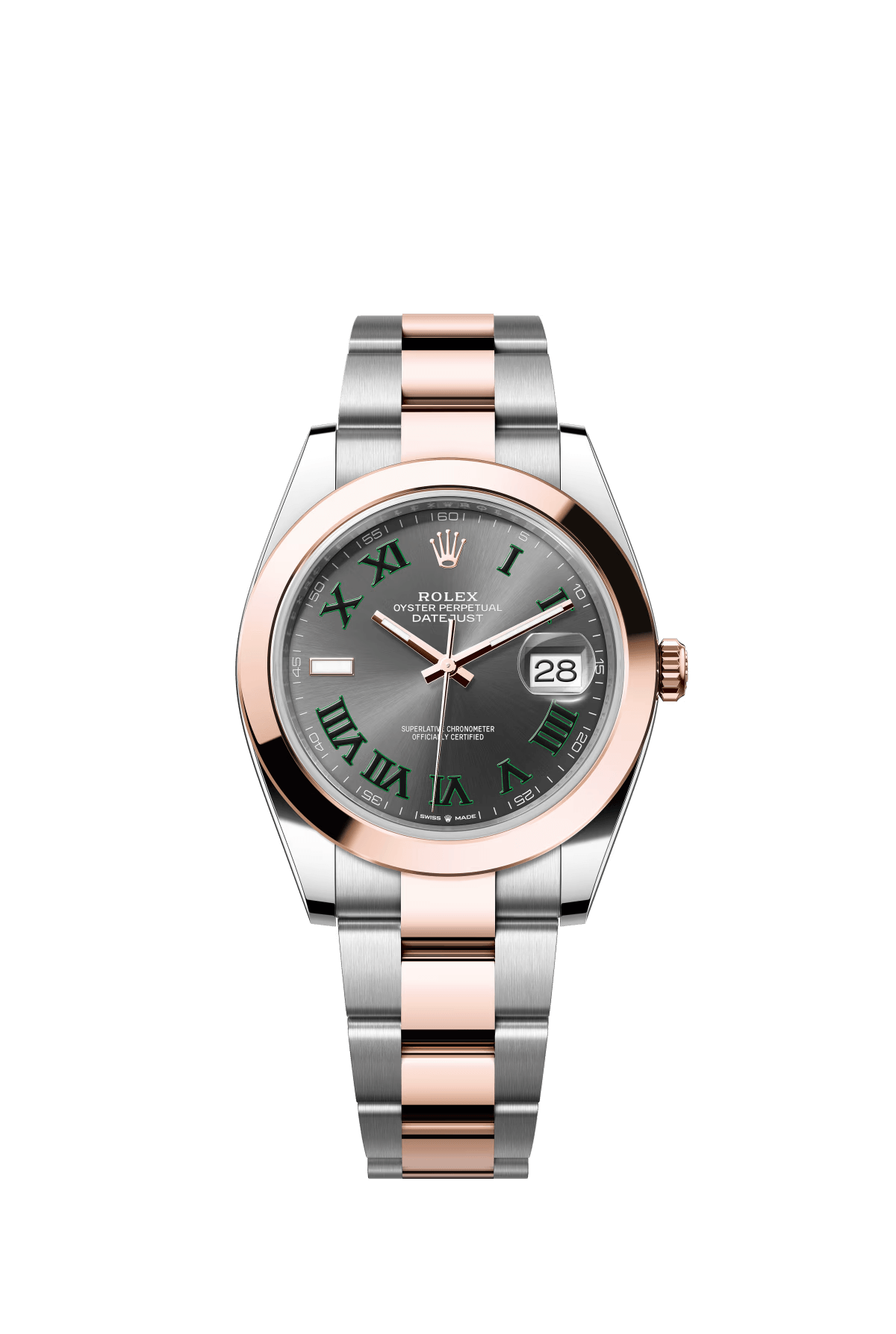 The Oyster Perpetual Datejust 41 is available in Everose gold and Oystersteel. with a slate-grey dial and an Oyster bracelet. -m126301-0015