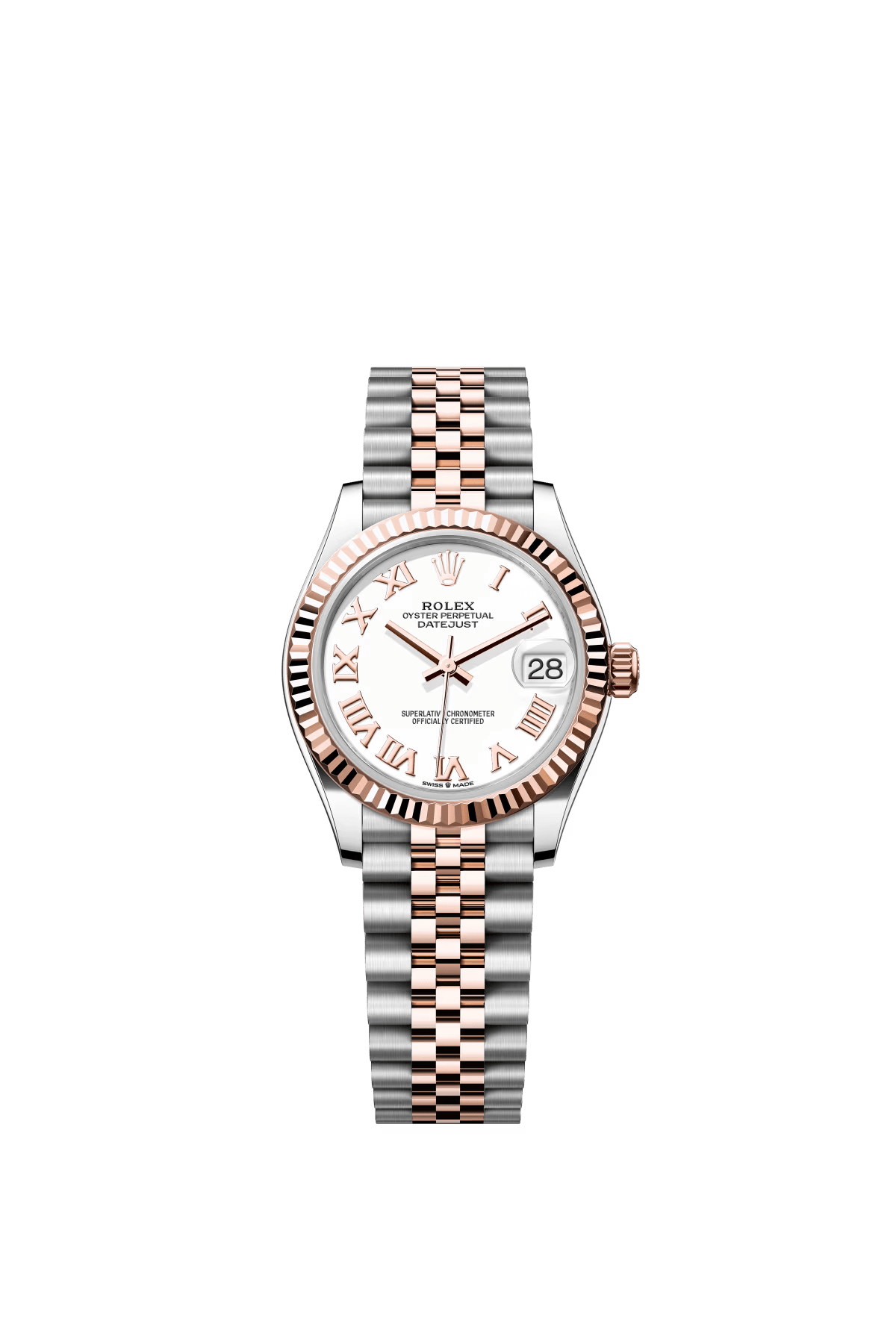 The Oyster Perpetual Datejust 31 is available in Everose gold and Oystersteel with a white dial and a Jubilee bracelet. -m278271-0002