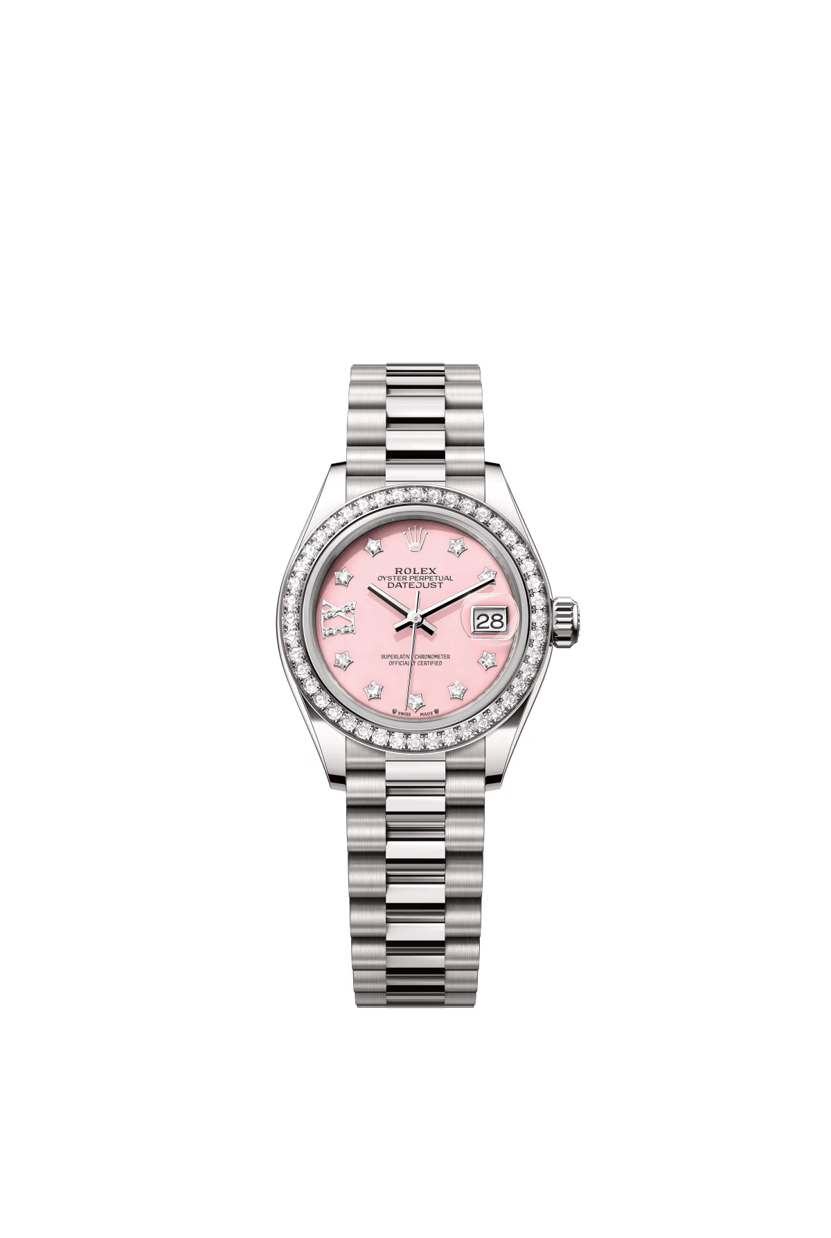 The Oyster Perpetual Lady-Datejust in 18 ct white gold with a diamond-set pink opal dial and a President bracelet. -m279139rbr-0002 28mm
