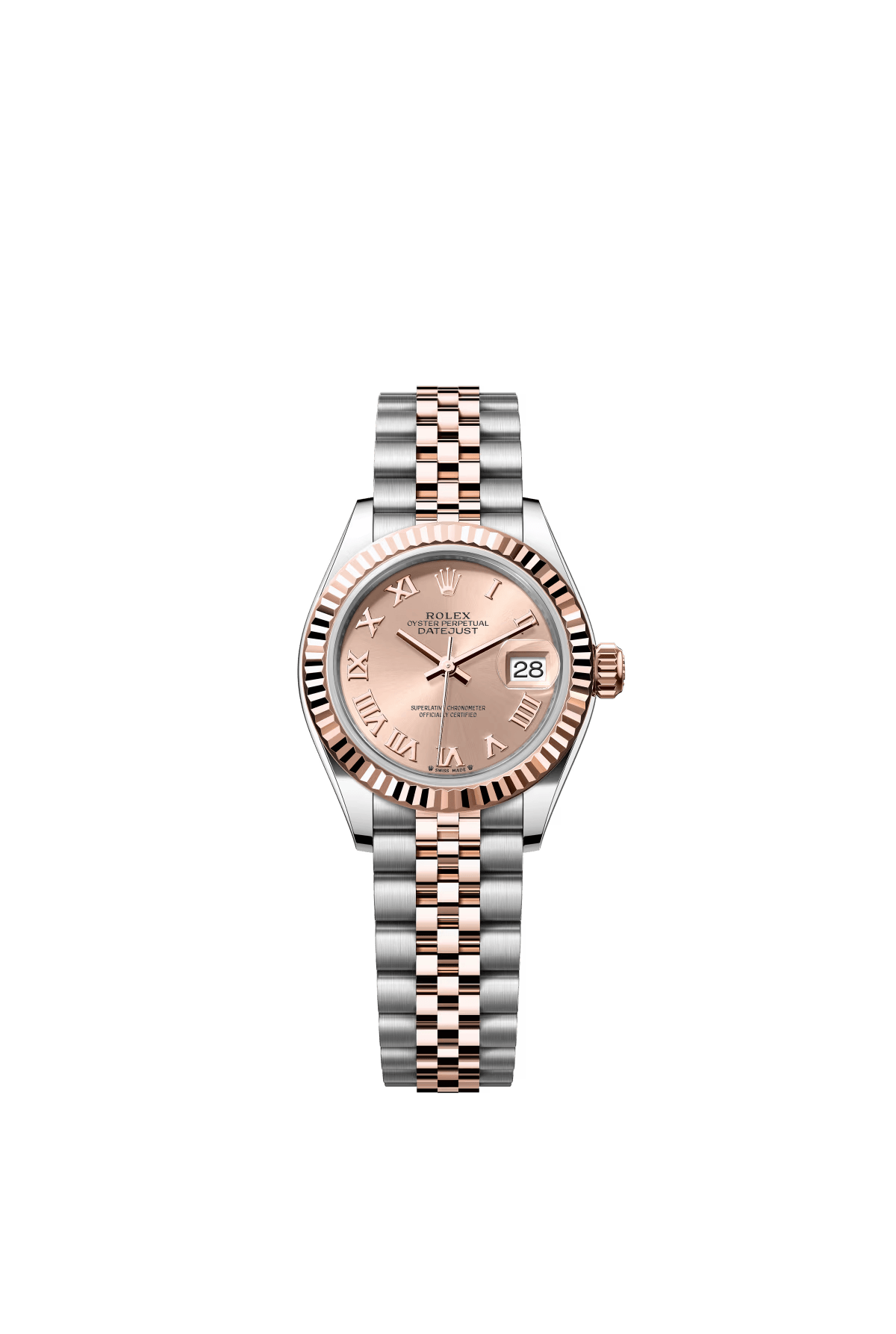 The Oyster Perpetual Lady-Datejust is available in Everose gold and Oystersteel with a rose gold-tone dial and a Jubilee bracelet. -m279171-0025 28mm
