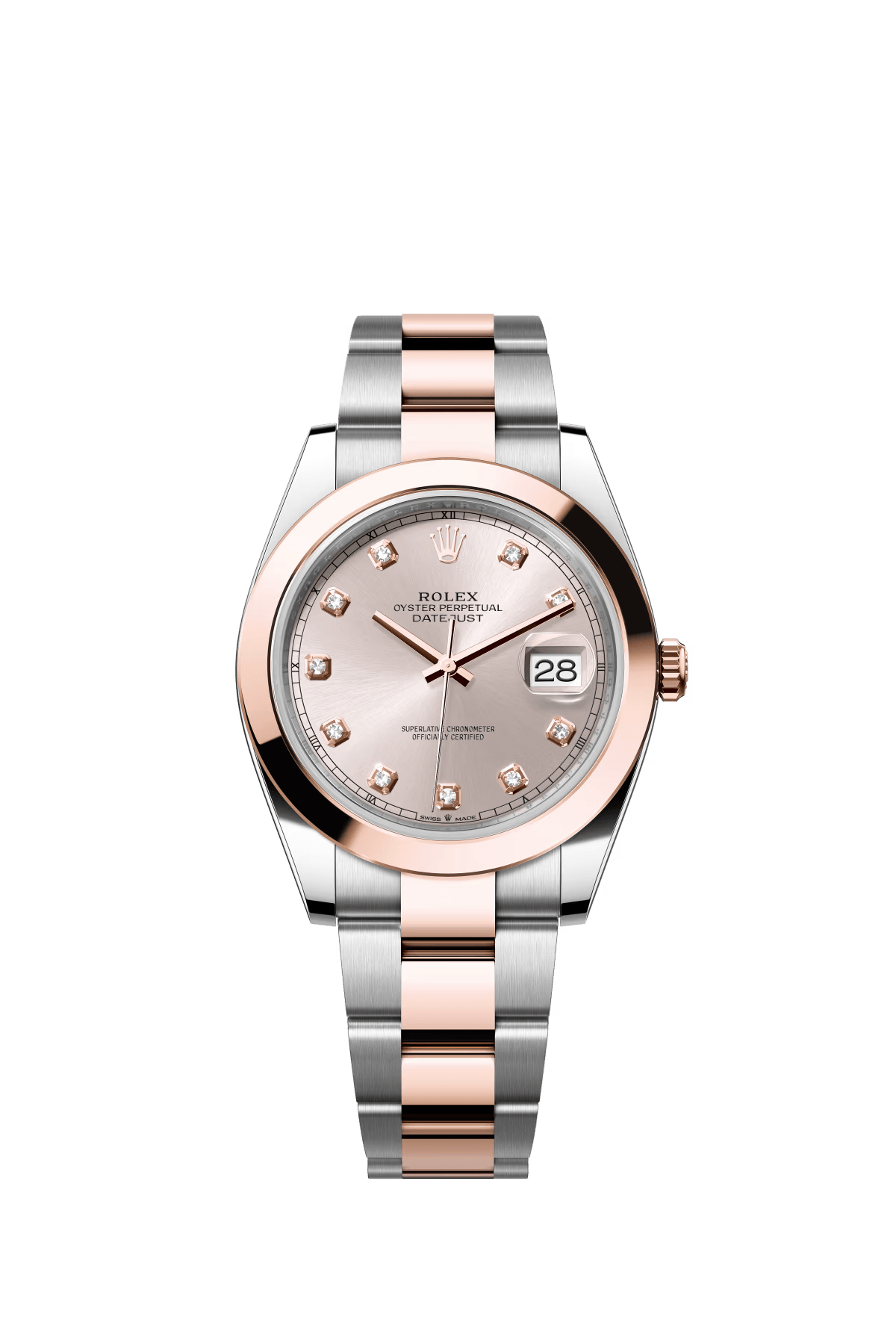The Oyster Perpetual Datejust 41 is available in Everose gold and Oystersteel with a diamond-set sunrise gold dial and an Oyster bracelet. -m126331-0007