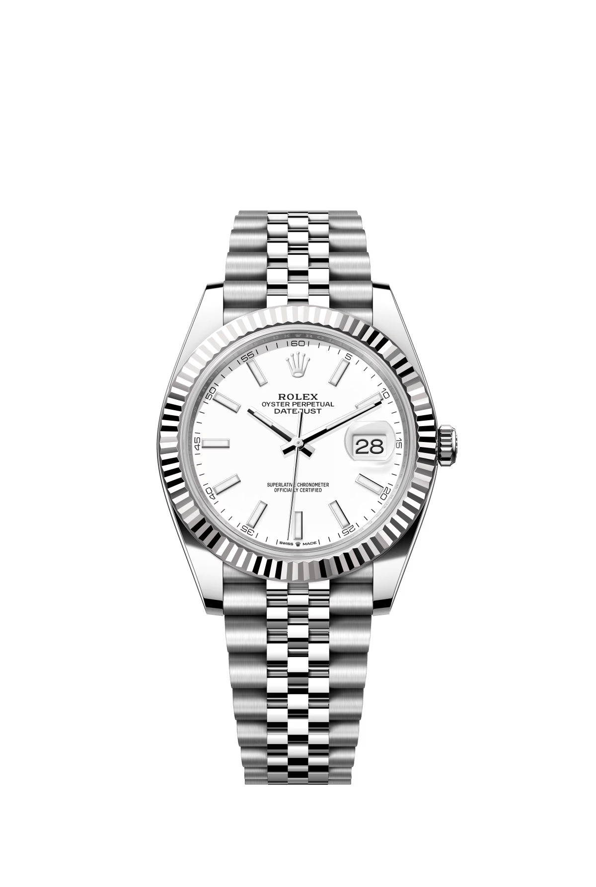 The Oyster Perpetual Datejust 41 is available in white gold and Oystersteel. with a white dial and a Jubilee bracelet. -m126334-0024
