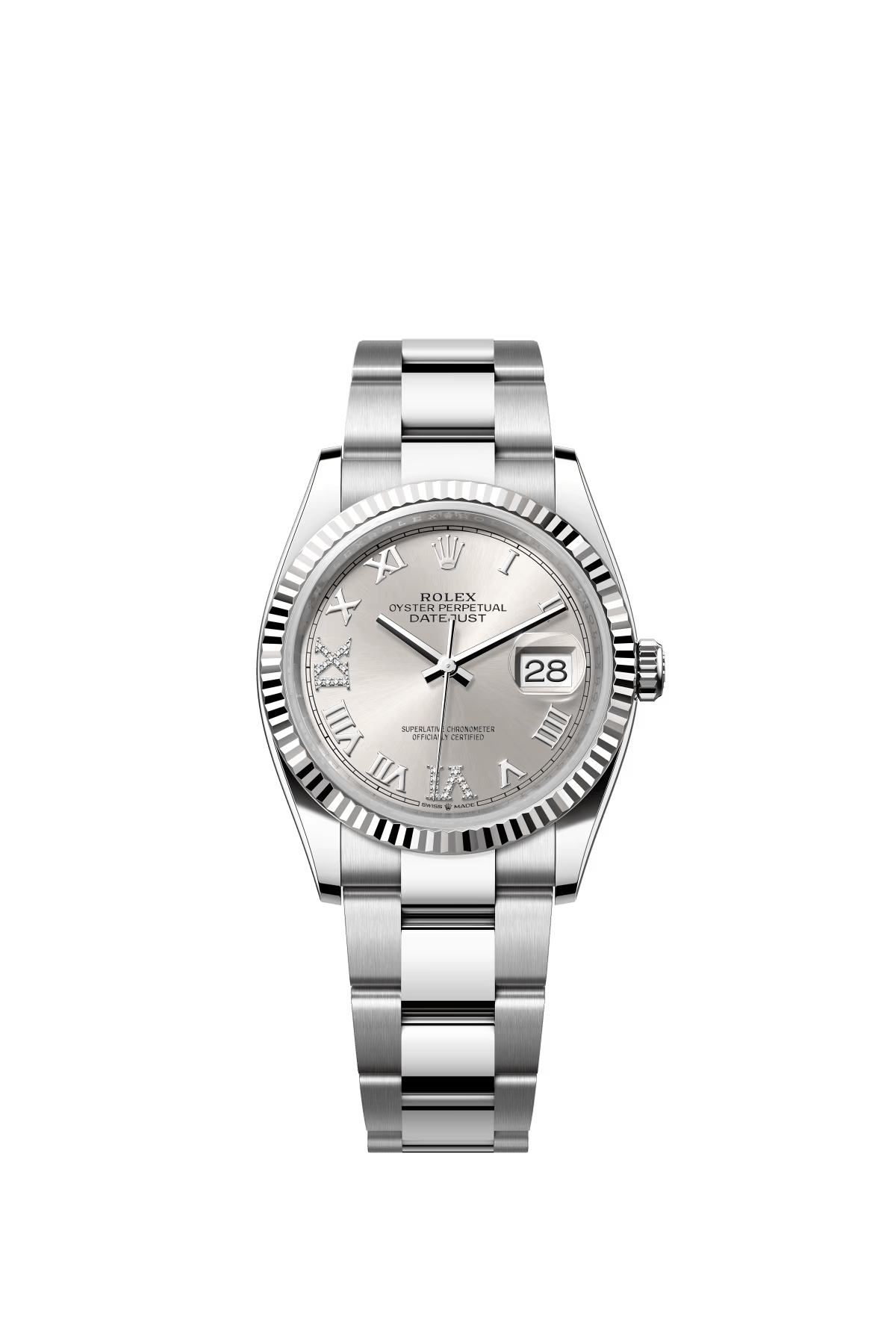 The Oyster Perpetual Datejust 36 is available in white gold and Oystersteel with a diamond-set silver dial and an Oyster bracelet. -m126234-0030