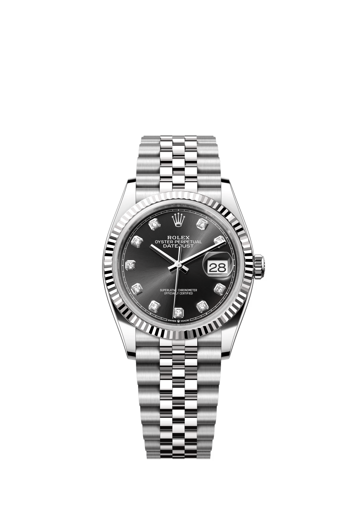 The Oyster Perpetual Datejust 36 is available in white gold and Oystersteel with a shiny black diamond-set dial and a Jubilee bracelet. -m126234-0027