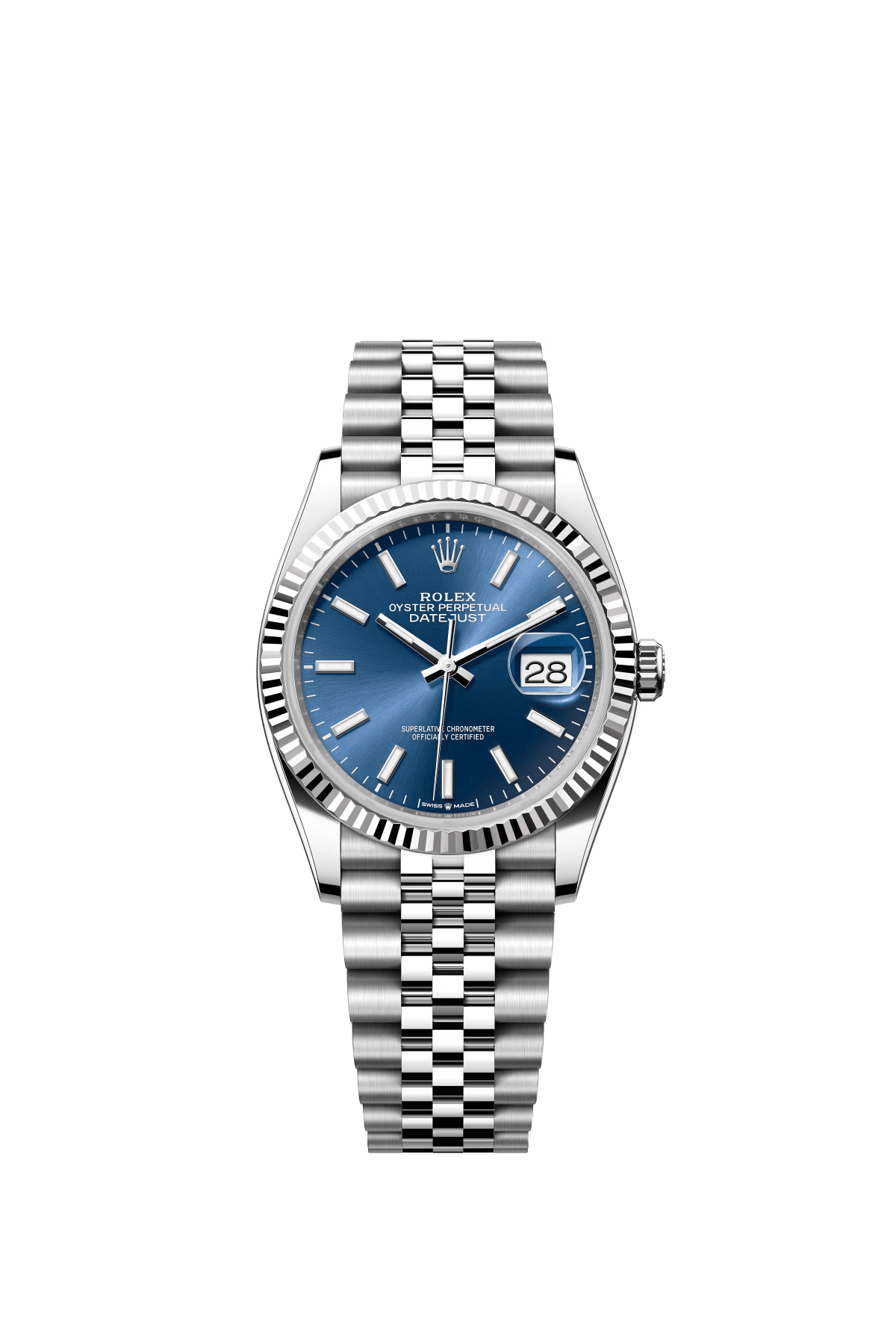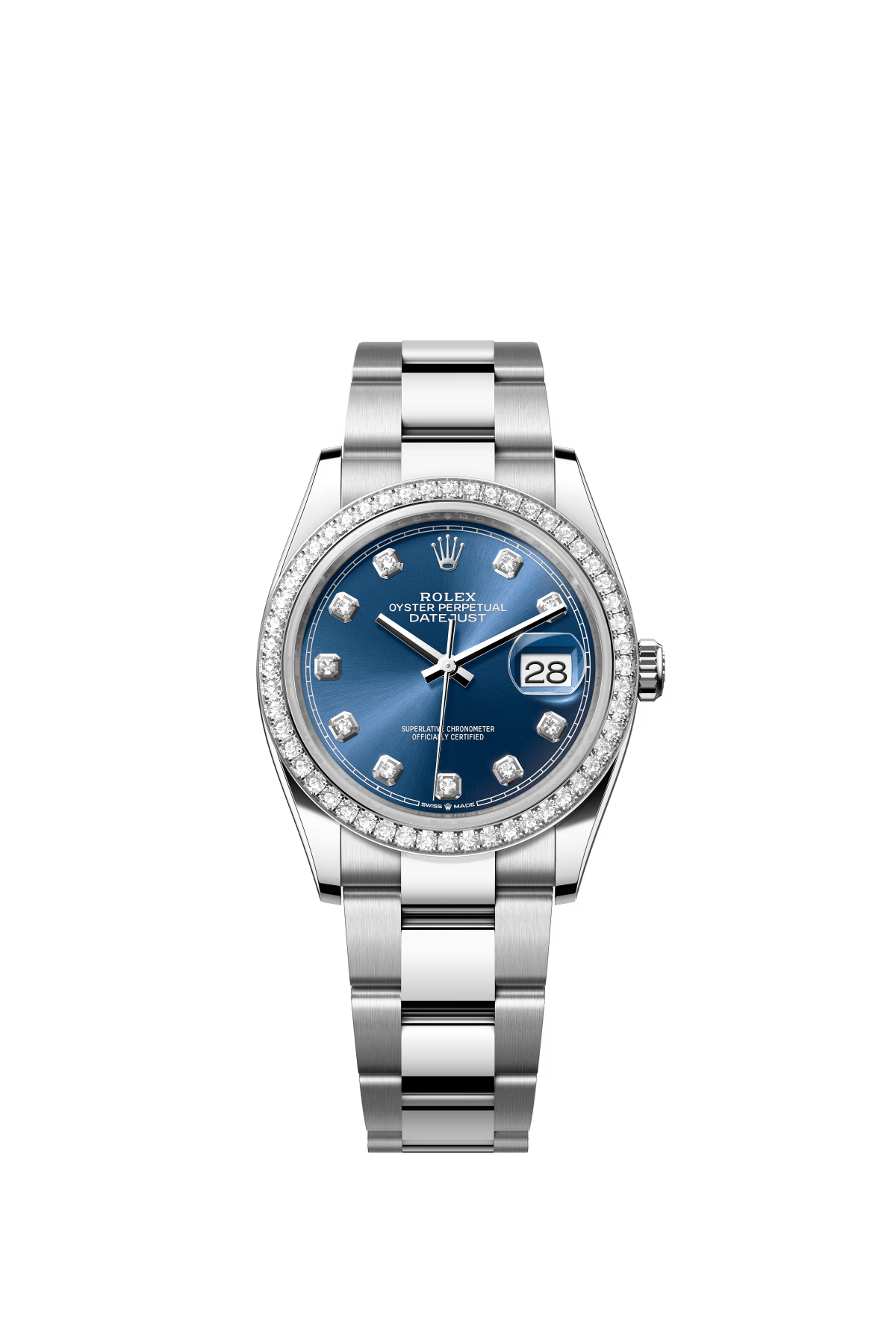 The Oyster Perpetual Datejust 36 is available in white gold and Oysteel. with a brilliant blue diamond-set dial and an Oyster bracelet. -m126284rbr-0030