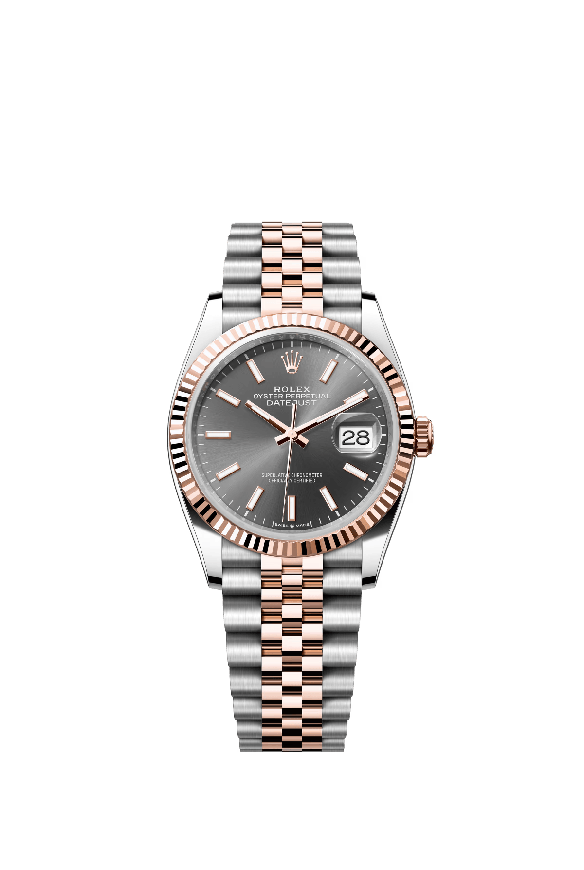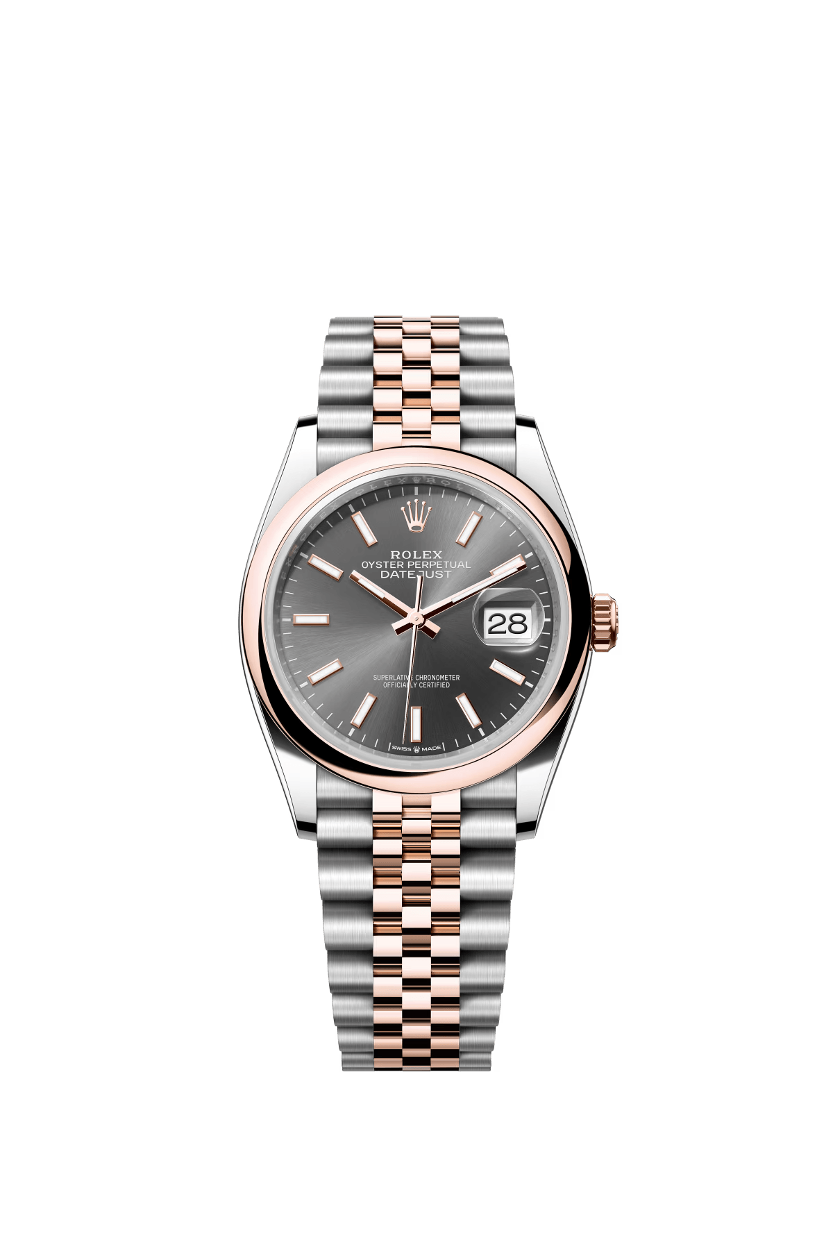 The Oyster Perpetual Datejust 36 is available in Everose gold and Oystersteel. with a slate grey dial and a Jubilee bracelet. -m126201-0013