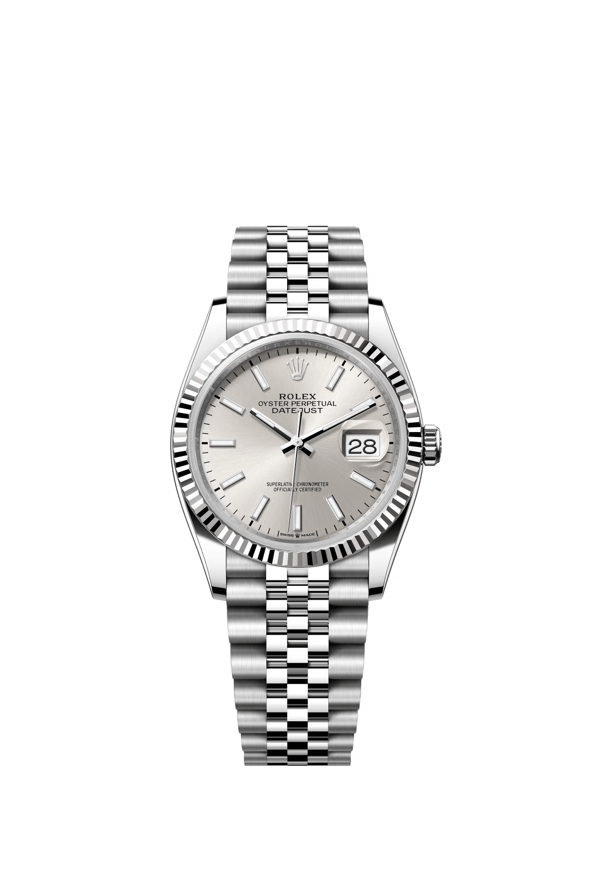 The Oyster Perpetual Datejust 36 is available in white gold and Oystersteel with a silver dial and a Jubilee bracelet. -m126234-0013