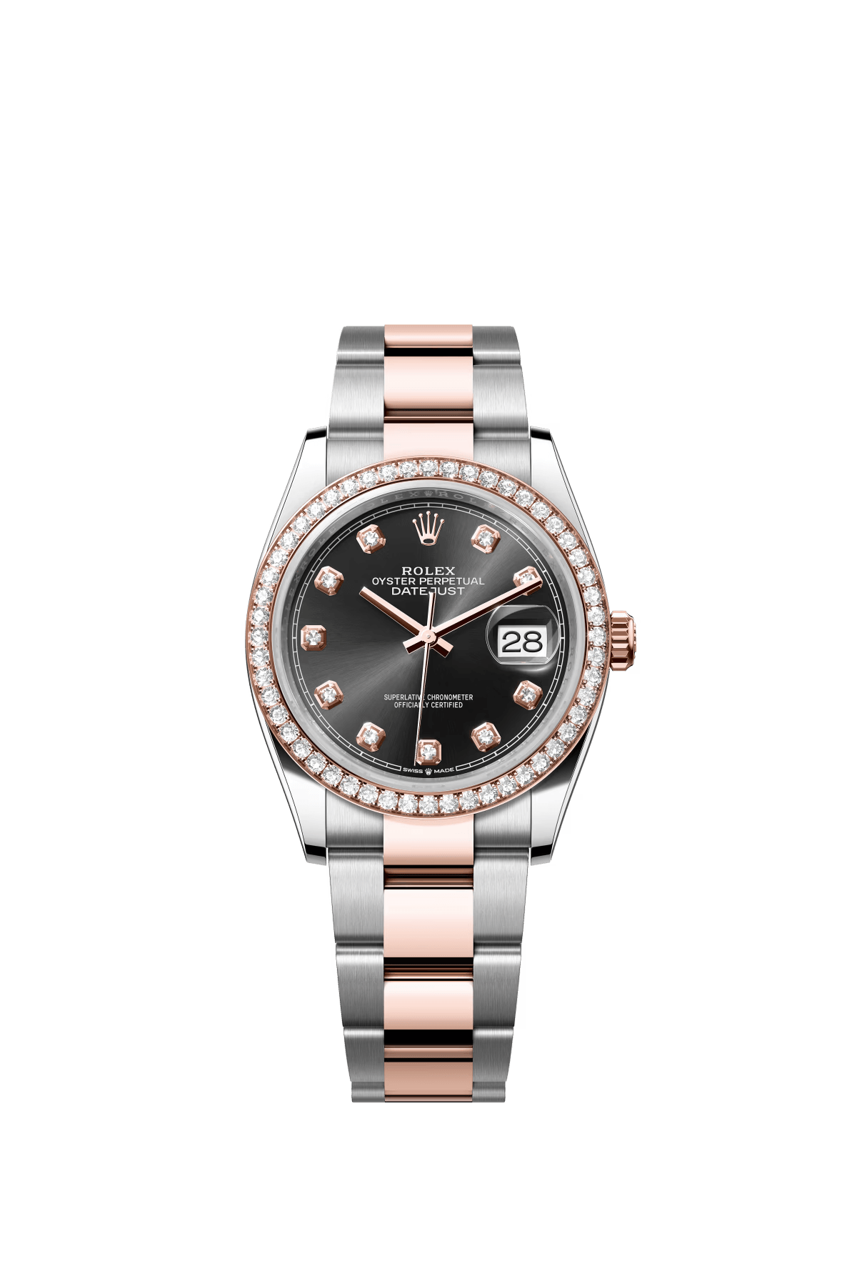 The Oyster Perpetual Datejust 36 is available in Everose gold and Oysteel. with a shiny black diamond-set dial and an Oyster bracelet. -m126281rbr-0008