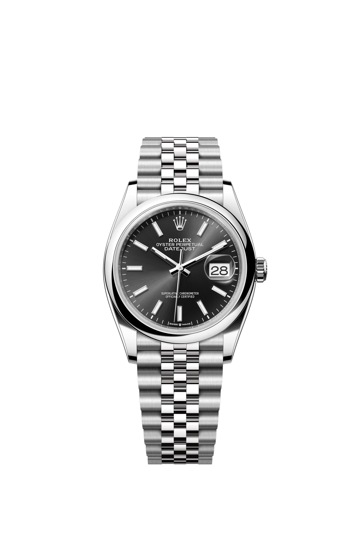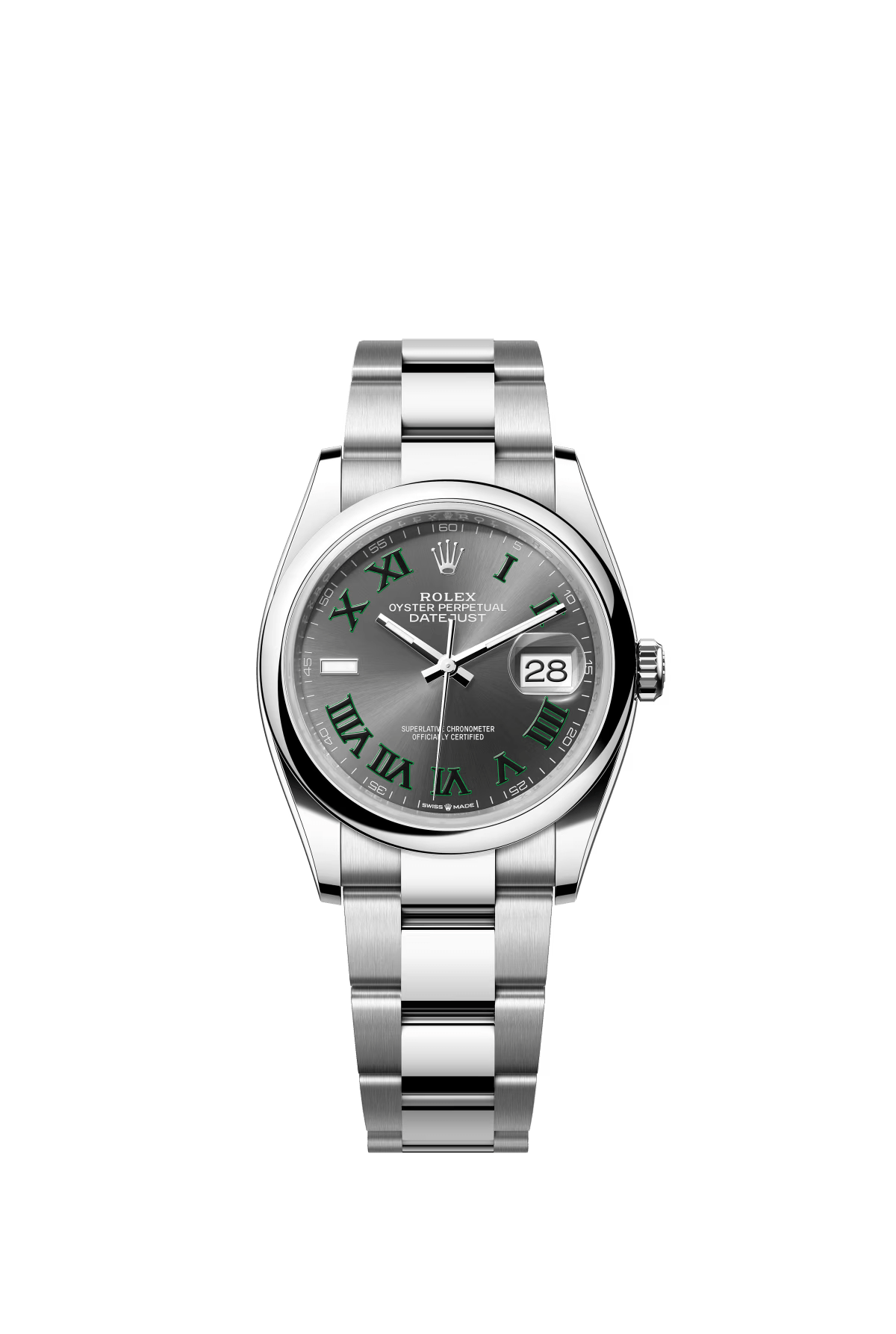 The Oyster Perpetual Datejust 36 is available in Oyster steel with a slate-grey dial and an Oyster bracelet. -m126200-0018