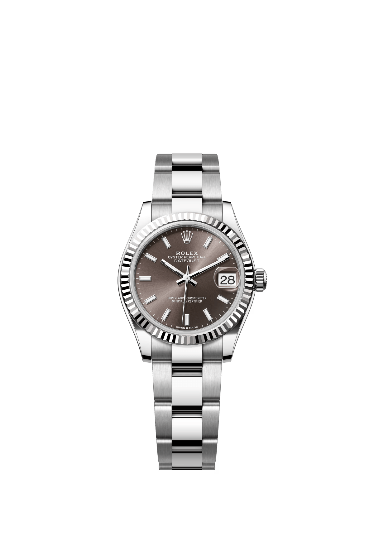 The Oyster Perpetual Datejust 31 is available in white gold and Oystersteel with a dark grey dial and an Oyster bracelet. -m278274-0015