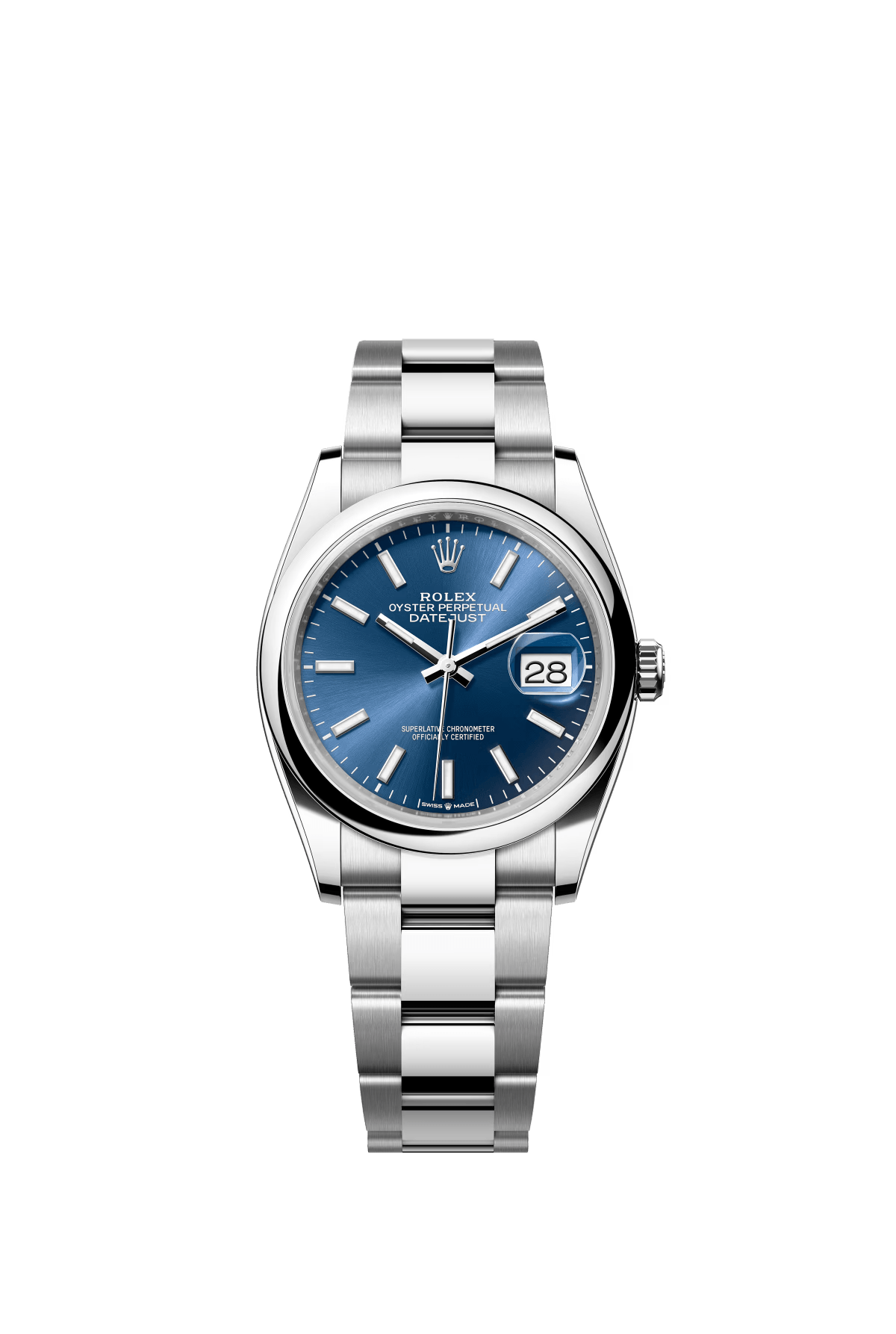 The Oyster Perpetual Datejust 36 is available in Oysteel with a bright blue dial and an Oyster bracelet. -m126200-0006